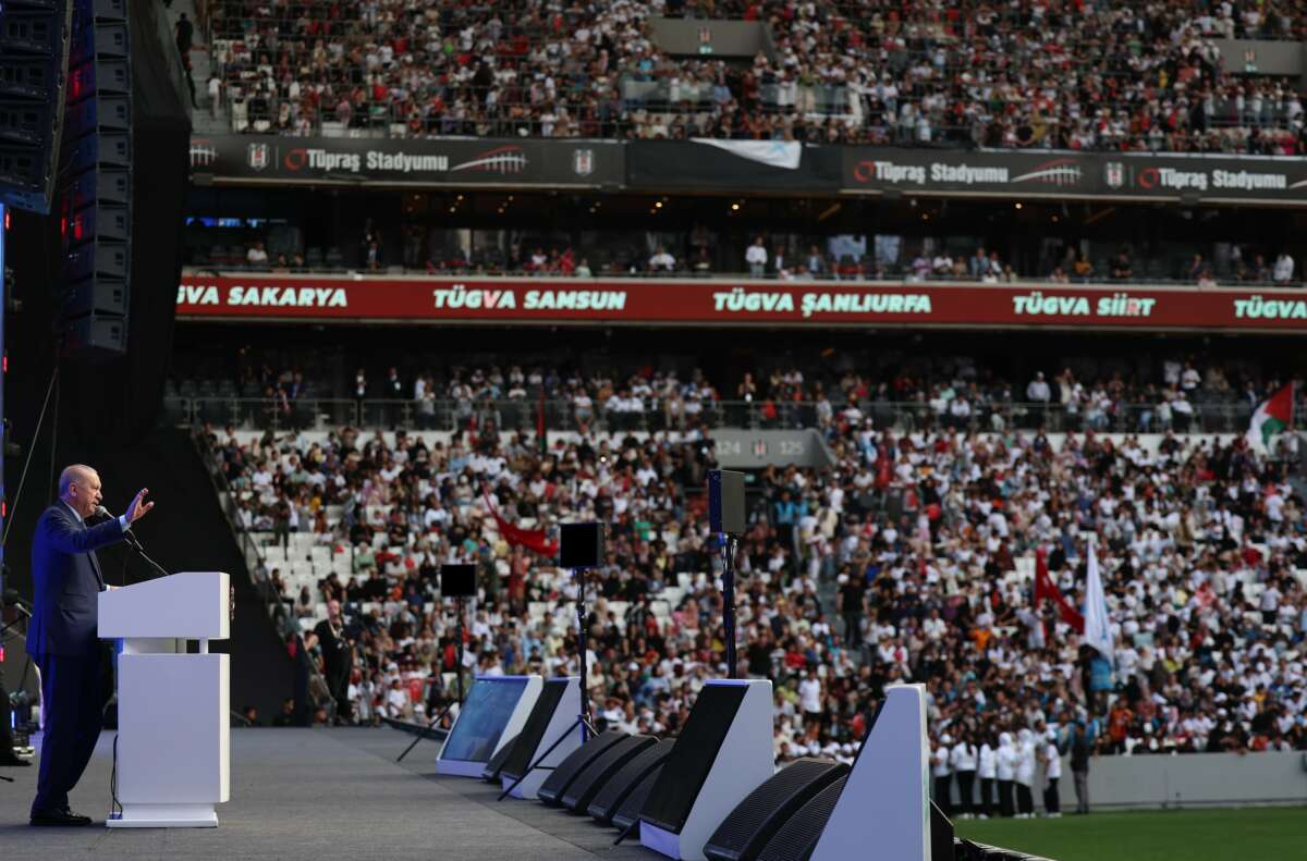 Gazze’de yaşananlara ilişkin de konuşan Cumhurbaşkanı Erdoğan, “İnanıyorum ki her biriniz Gazze’de yaşananları takip ediyorsunuz. Filistinli kardeşlerimiz, Siyonist cinayet şebekesinin yüzde 90’ını yerle yeksan ettiği Gazze’de açlıkla, susuzlukla, ilaçsızlıkla mücadele ediyor. Her gün karnı sırtına yapışmış masum bebeklerin, çocukların, kadınların şehadet haberini alıyoruz. Gazze’deki masumlar gıda dağıtım merkezi olarak adlandırılan kıyım merkezlerinde bitkinlikten bayılıyor. Kalleş kurşunların hedefi oluyor. Anne ve babalar enkazların arasında kilometrelerce yol yürüyüp bir çuval un alabilmek, bir yudum suya erişebilmek için canlarını tehlikeye atıyor. Benzerlerini yalnızca toplama kamplarında göreceğimiz sahnelerin çok daha kötüsü şu an Gazze’de sözde medeni dünyanın gözleri önünde yaşanıyor. Şunu bugün bir kez daha açık açık ifade ediyorum. Gazze’de son asrın en vahşi soykırımı yaşanmaktadır. Gazze’de sadece çocuklar, sadece bebekler değil, insanlık adına ne varsa masumların kanından beslenen bir avuç caninin elinde yok edilmektedir” şeklinde konuştu.