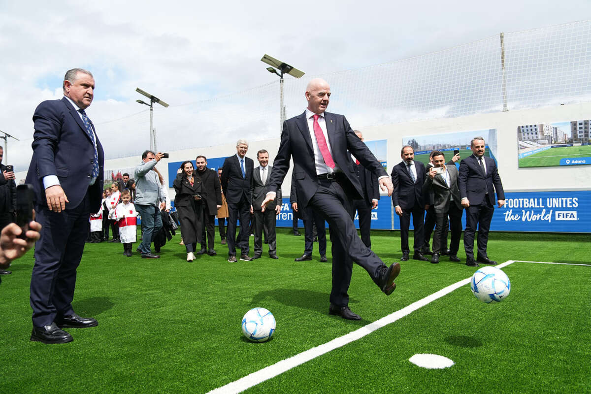 FIFA Başkanı, Türkiye’de 60 saha açmayı planladıklarını ancak bu sayıyı 100’e de çıkarabileceklerini dile getirdi. Infantino, “Bugün burada bulunmamızın sebebi FIFA Arena projesi çerçevesinde sahamızın alışını gerçekleştirmek. FIFA’nın üyesi olan ülkelerde 100’den fazla saha açmayı istiyoruz. Şu ana kadar Türkiye’de 11 tanesi tamamlandı. Deprem bölgesine ufak da olsa bir katkı yapmayı, oradaki çocuklara bir futbol armağanı verip yüzlerini güldürmeyi amaçladık. Türkiye’de 60 saha planladık ama belki 100 tane de olabilir. Birlikte bunu da başarabiliriz. Eminim ki bu sahaların yapımında bize destek olacak ortakları da bulacağız. En önemlisi buradaki çocuklara bir fırsat tanımış oluyoruz, sağlıklı bir ortamda futbol oynamaları için. Bunun yanında çocuklar okula geldiğinde belki derslerden sıkıldıklarında sahayı görecekler ve mutlu olacaklar. Futbol bizler gibi yetişkinlerin de bir araya geldiği bir yer” dedi.