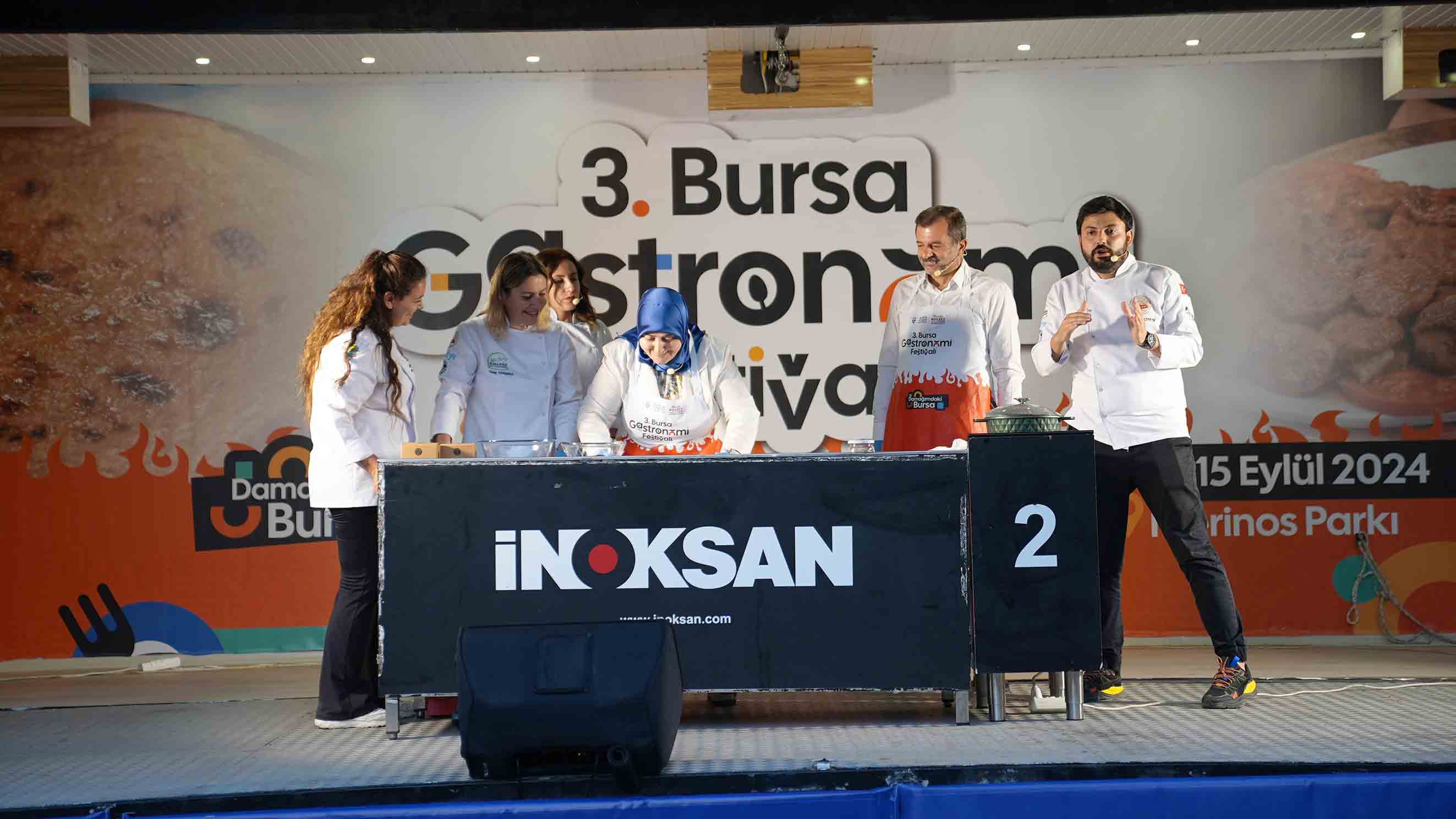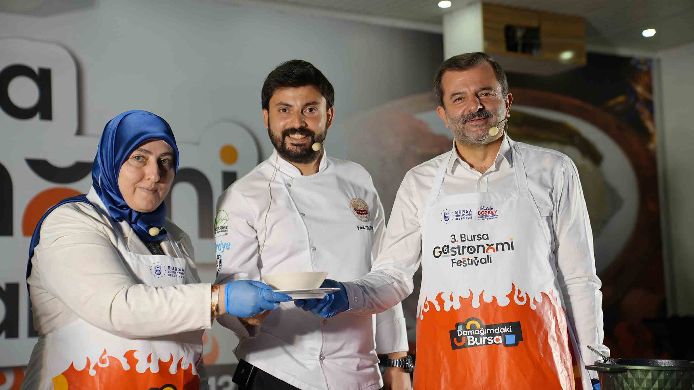 Bursa’nın lezzetlerini ilçelerle buluşturmak ve Bursalıları festivale davet etmek amacıyla Büyükşehir Belediyesi tarafından ilçelerde gezdirilen Gastronomi Tırı’nın yeni durağı Gürsu oldu. Belediye Başkanı Mustafa Işık ve Eşi Sümeyye Işık tarafından sahnede özel bir mutfakta hazırlanan menü ile Gürsu’nun lezzetleri tanıtıldı. Akademisyen Şef Fatih Yıldırım, Bursa Aşçılar Derneği Kadın Kolları Başkanı Tülay Dönmez, Eğitmen Şef Selin Sekizkardeşler ve Eğitmen Şef AybiçeTaylak’ın yardımları ile anlatılan menüde Gürsu bamyasından bamya çorbası, hinkal ve armutlu kurabiye yapıldı.