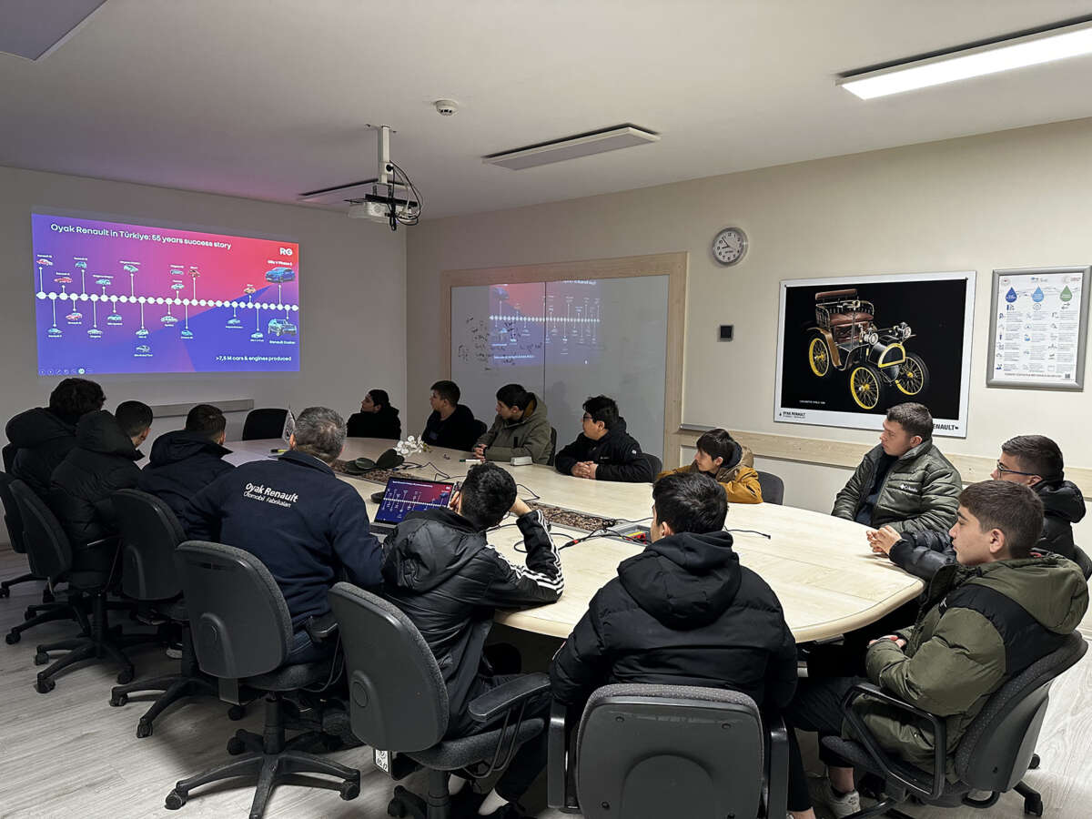Oyak Renault Enerji Yöneticisi ve Elektrik Mühendisi Tuncay Kocausta, öğrencilere enerji verimliliği ve yenilenebilir enerji kaynaklarının kullanımını basit deneylerle anlattı. Eğitim sonrasında öğrenciler, fabrikanın kompresör atölyesi, soğutma kulesi ve kazan dairesi gibi bölümlerini gezerek, sistemler hakkında detaylı bilgiler edindi.