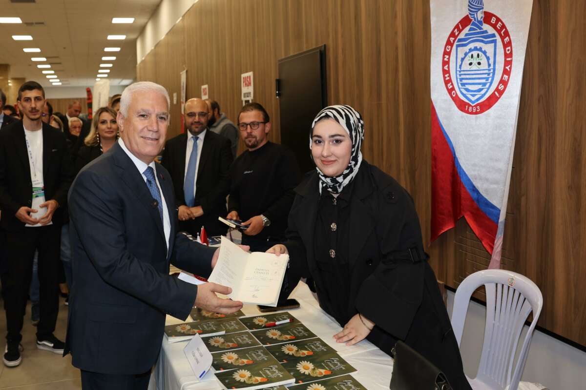 Orhangazi Belediyesi tarafından Büyükşehir Belediyesi Gençlik Merkezi’nde düzenlenen Kitap Günleri’ni ziyaret ederek gençlerle bir araya gelen Büyükşehir Belediye Başkanı Mustafa Bozbey, ‘Cumhuriyet demek…’ dijital kampanyası hakkında sohbet etti. Öğrencilere kampanyanın amacını anlatan Başkan Bozbey, gençlere tek tek ‘Cumhuriyet demek…’ diyerek cümleyi tamamlamalarını istedi. Gençlerden ‘Özgürlük, bağımsızlık, çağdaşlık, milli egemenlik, güven, mutluluk’ gibi cevaplar alan Başkan Bozbey, kullanılan ifadelerin umut verici olduğunu söyledi. Ortaya çıkan fikirlerden duyduğu memnuniyeti dile getiren Başkan Bozbey, öğrencileri tek tek ödüllendirdi. Kitap Günleri kapsamında hazırlanan stantları da gezen Başkan Bozbey, kitaplarını imzalayan yazarlarla ve kitap tutkunlarıyla sohbet etti.
