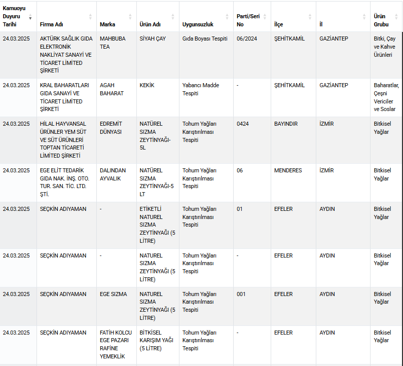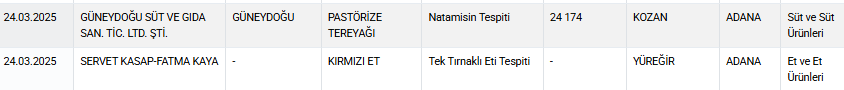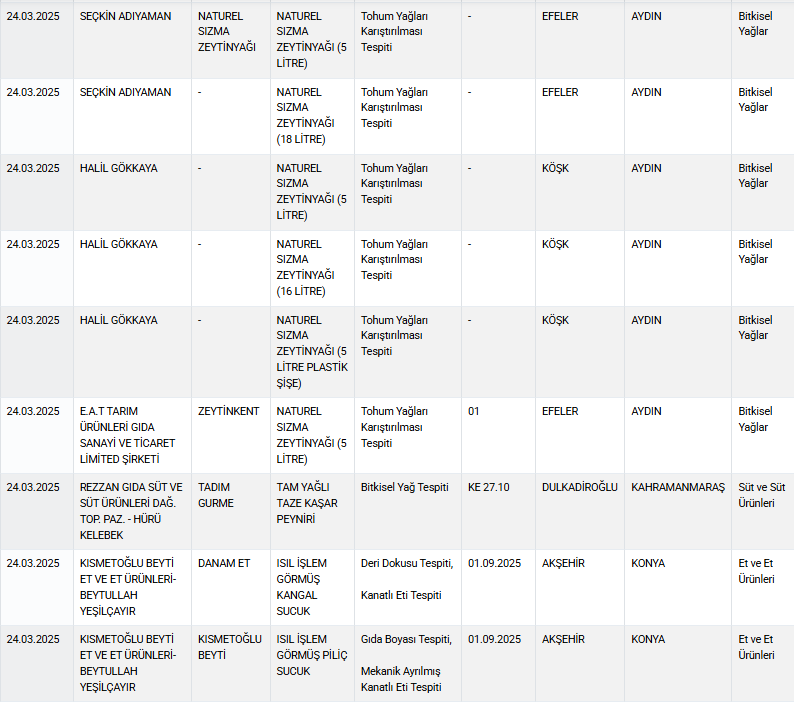 Bakanlık ayrıca taklit veya tağşiş yapılan gıdalar listesini de güncelleyerek 19 yeni ürünü listeye dahil etti. Denetimler sonucunda aşağıdaki ihlaller tespit edildi: