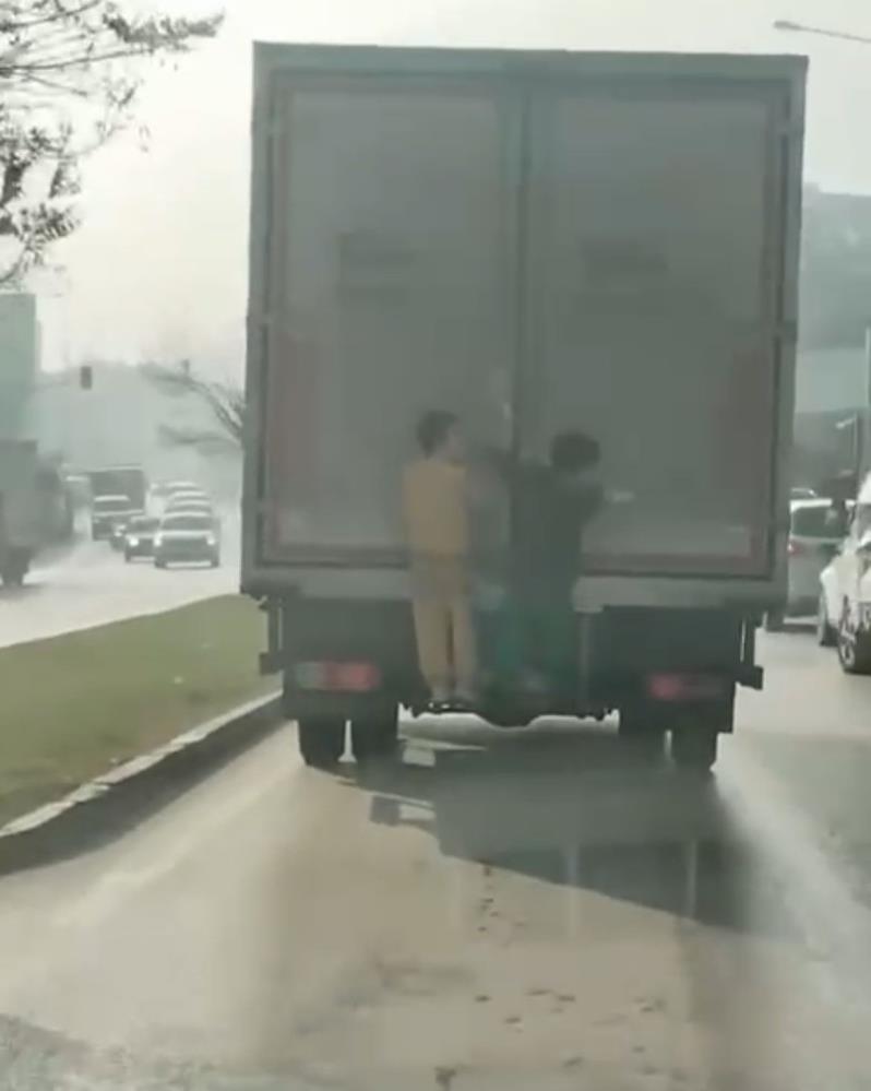 Bursa'da iki çocuğun seyir halindeki kamyonun arkasına tutunarak dakikalarca yolculuk yapmaları yürekleri ağza getirdi.