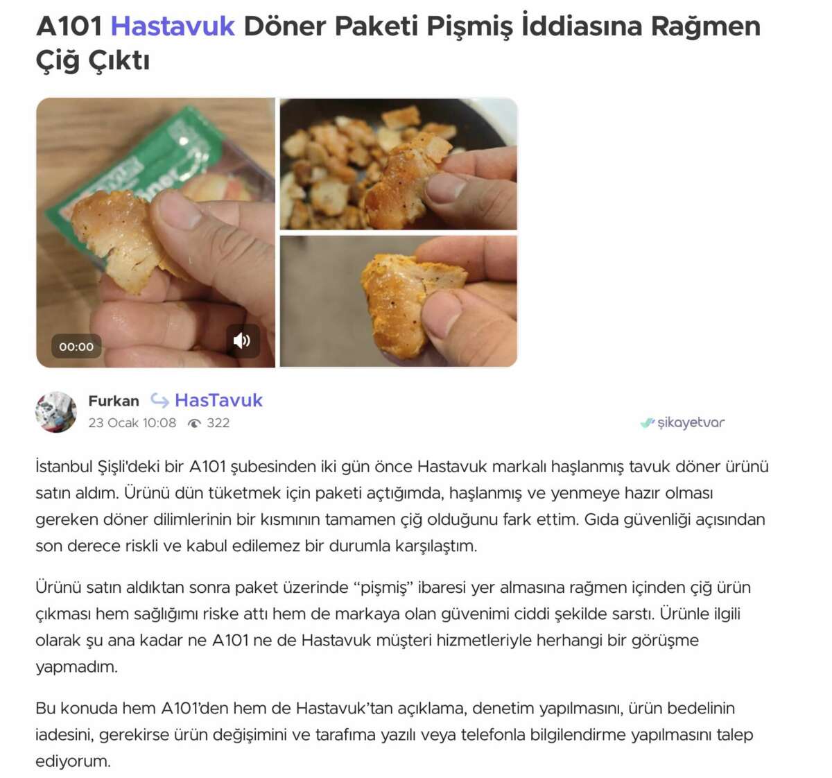 Tüketici, iki gün önce aldığı ve haşlanmış, yenmeye hazır olarak satılan tavuk döneri tüketmek için açtığında, dilimlerin bir kısmının tamamen çiğ olduğunu fark ettiğini belirtti. Ambalaj üzerinde “pişmiş” ifadesi yer almasına rağmen karşılaşılan durumun hem sağlık açısından risk oluşturduğunu hem de markaya duyulan güveni sarstığını ifade etti.