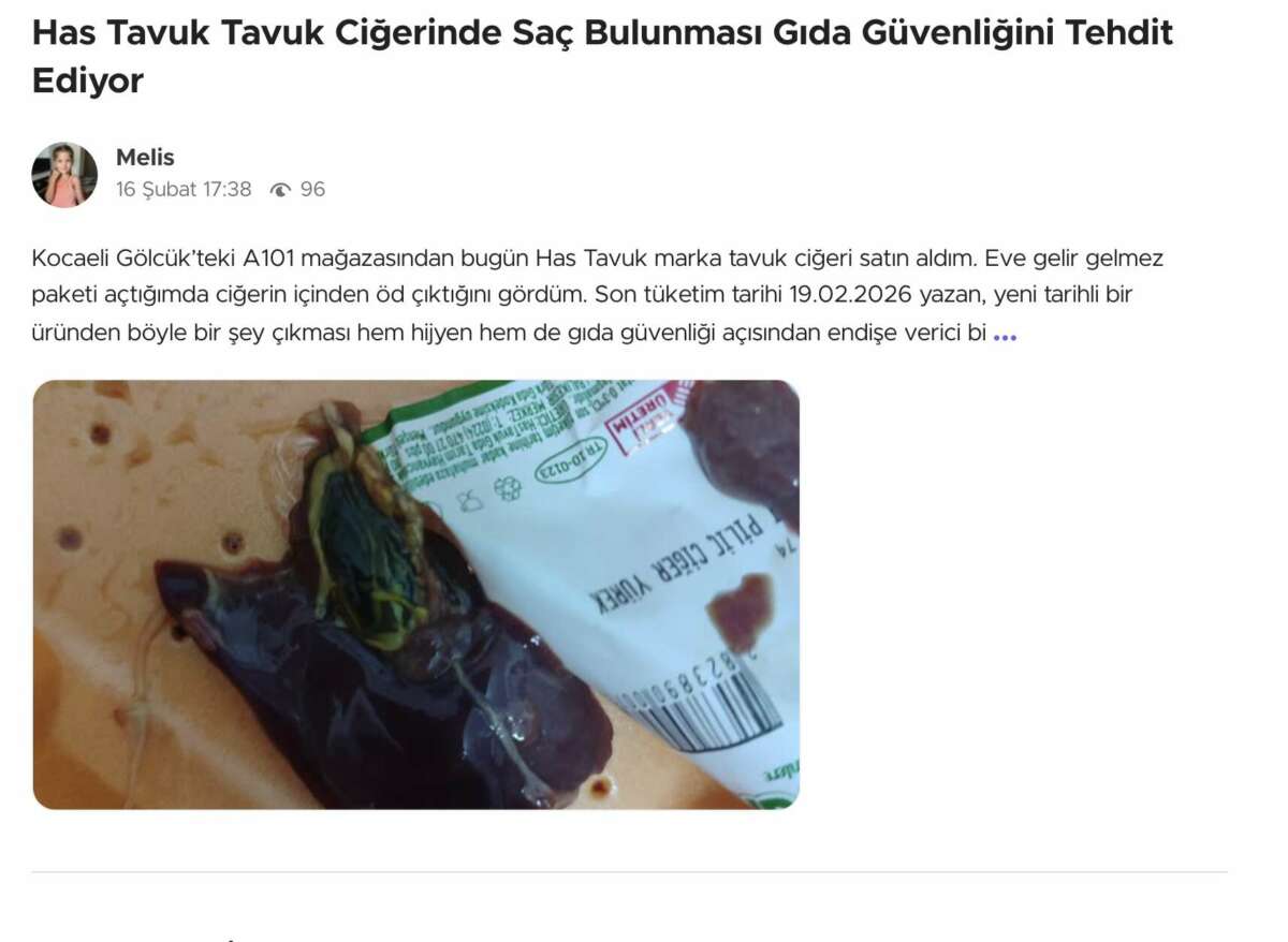 Gölcük’te satın alınan Hastavuk marka tavuk ciğerinde ise ürünün içinden “öd” çıktığı öne sürüldü. Son tüketim tarihi 19.02.2026 olan ürünün yeni tarihli olmasına rağmen bu şekilde satışa sunulmasının hijyen ve kalite kontrol açısından endişe yarattığı dile getirildi.
