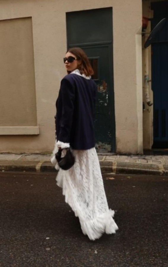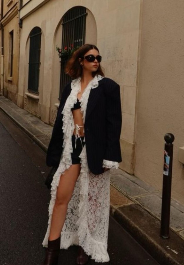 Tamamen beyaz dantel hırkasının içine siyah kısa tayt ve siyah sütyen giyen Saraçoğlu kombinini ise oversize çizgili bir ceket ile tamamladı.