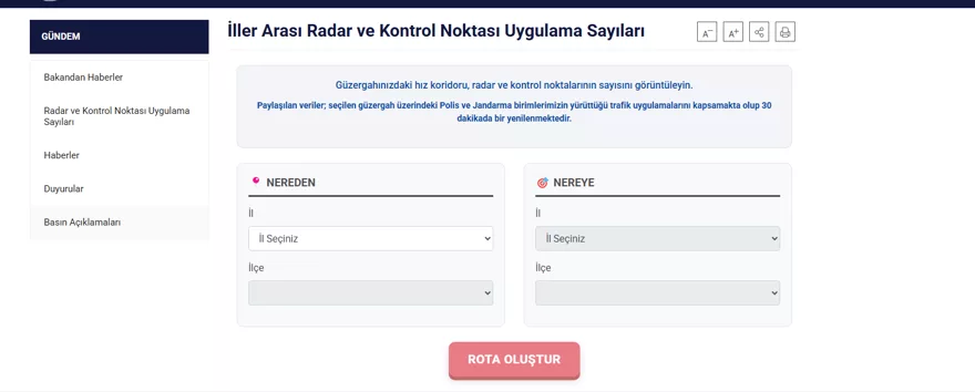 Bu alanlar yola çıkılacak il ve ilçe, gidilecek il ve ilçe şeklinde doldurulduktan sonra “Rota oluştur”a bastıktan sonra rota üzerindeki radar, hız koridoru ve kontrol noktaları görüntüleniyor.