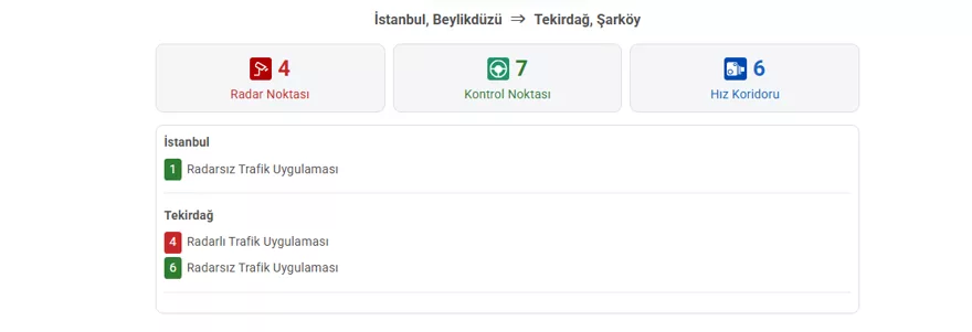 Bir başka örnek olarak, İstanbul Beylikdüzü’nden Tekirdağ Şarköy’e gitmek isteyen bir sürücünün önüne dört radar noktası, 7 kontrol noktası ve 16 hız koridoru çıkacak.