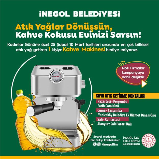 İnegöl Belediyesi’nden yapılan açıklamada Temizlik İşleri Müdürlüğü organizasyonuyla “Atık Yağlar Dönüşsün, Kahve Kokusu Evinizi Sarsın” sloganıyla yeni bir kampanyanın başladığı duyuruldu. 25 Şubat Salı 10 Mart Pazartesi tarihlerinde en fazla bitkisel atık yağ getiren 1 kişiye Kahve Makinesi hediye edilecek.