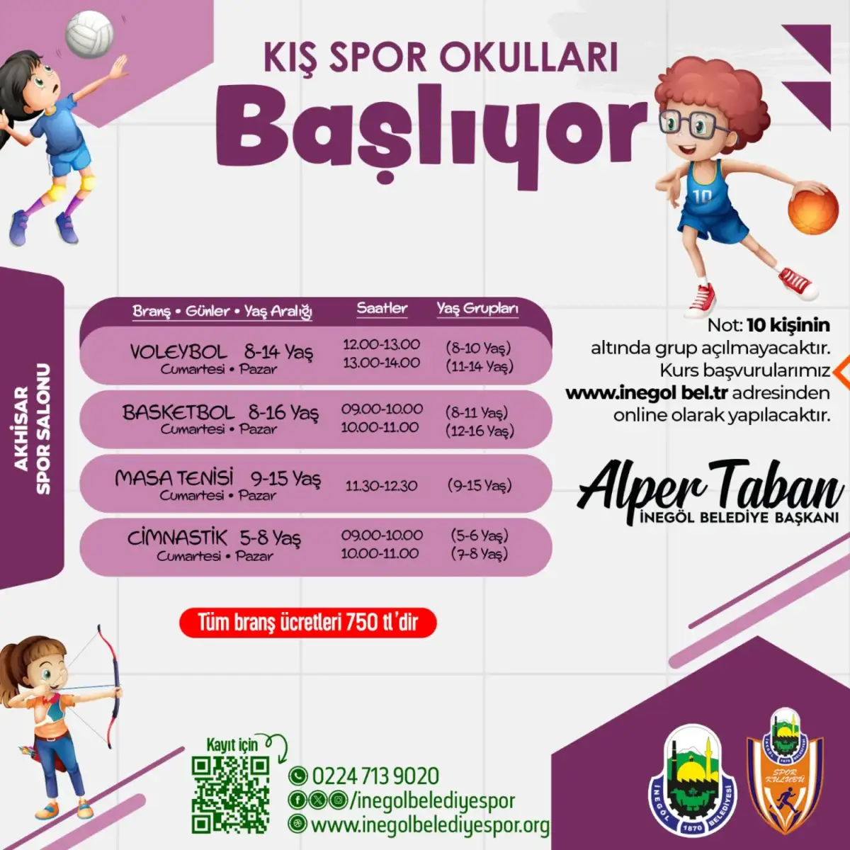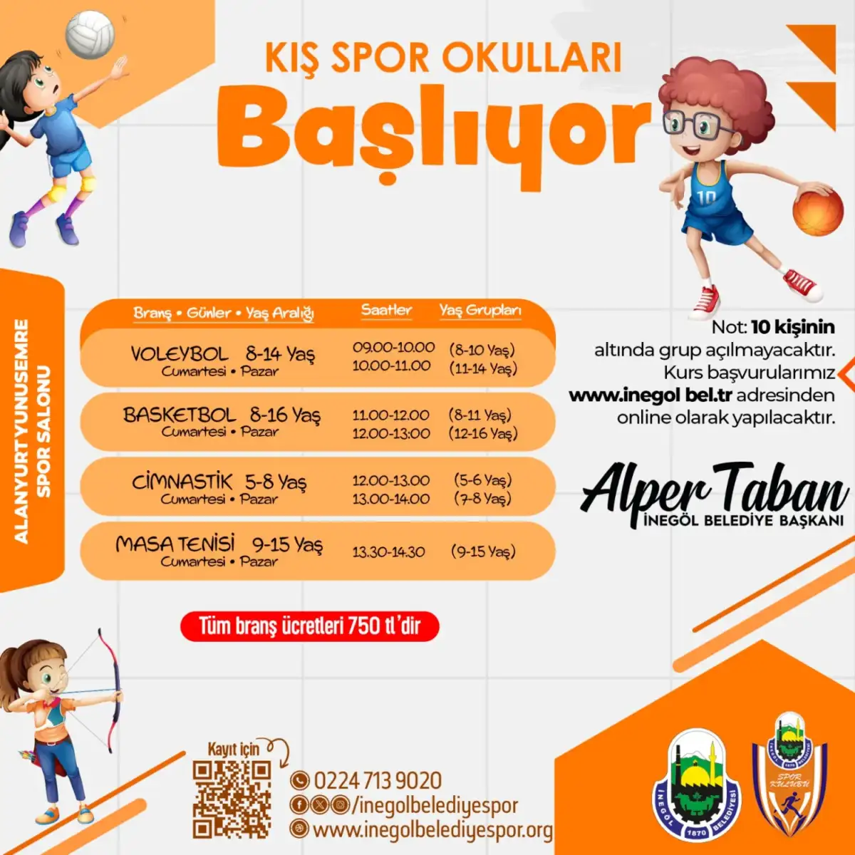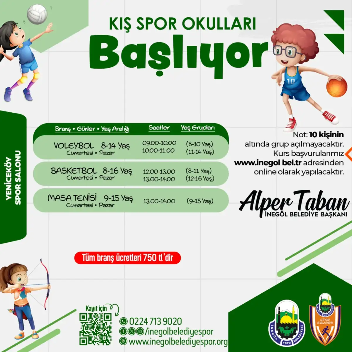 Konuya ilişkin açıklama yapan Belediye Başkanı Alper Taban, İnegöl Belediyesi Kış Spor Okullarının kayıtlarının devam ettiğini duyurdu. 13 Eylül tarihinde eğitimlerin başlayacağını hatırlatan Başkan Taban, “İnegöl Belediyesi Kış Spor Okullarımız bu yıl 6 ayrı branşta gerçekleştirilecek. Voleybol, basketbol, jimnastik, okçuluk, masa tenisi ve spor tırmanış branşlarında yapılacak eğitimler, Cumartesi ve Pazar günleri gerçekleştirilecek. Aynı zamanda Yunus Emre Spor Kompleksinde, Yeniceköy Spor Salonunda ve yapımını yeni tamamladığımız Akhisar Spor Salonumuzda kış spor okulu eğitimlerimiz olacak. Kış spor okullarımızda çocuklarımız için 5 yaştan 15 yaşa kadar eğitim imkanı sunuluyor” dedi.