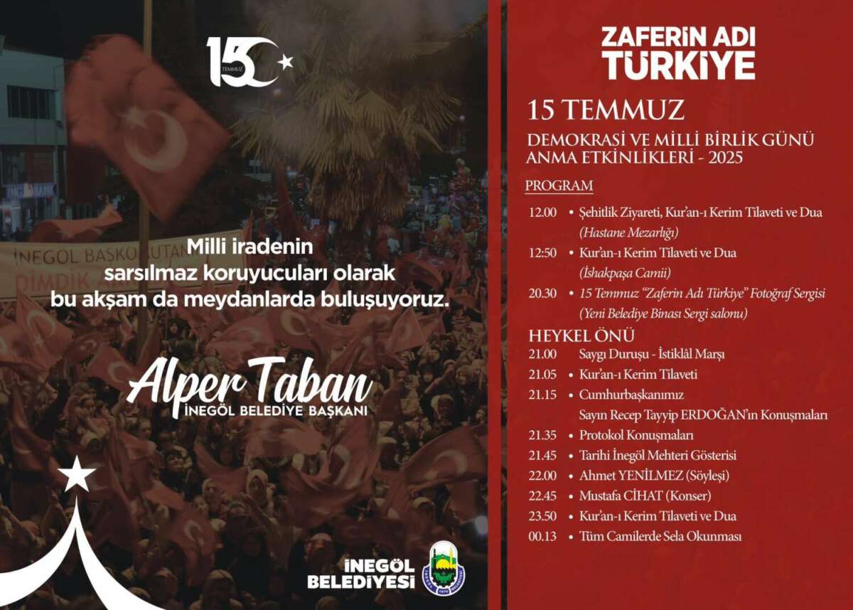 Akşam saatlerinde ise tüm İnegöllüler, Heykel Meydanı’nda buluşacak. Burada kurulacak sahnede 21.15 itibariyle Cumhurbaşkanı Recep Tayyip Erdoğan’ın konuşmaları ve İnegöl protokolünün konuşmaları ile program başlayacak. Dualar ve Kuran-ı Kerimlerin de okunacağı programda 21.45’te Tarihi İnegöl Mehteri sahne alacak. 22.00’de tiyatro sanatçısı Ahmet Yenilmez’in söyleşisiyle devam edecek etkinlikler, 22.45’te sanatçı Mustafa Cihat’ın vereceği konserle taçlanacak. Dualar ve 00.13’te okunacak salalarla program sona erecek.