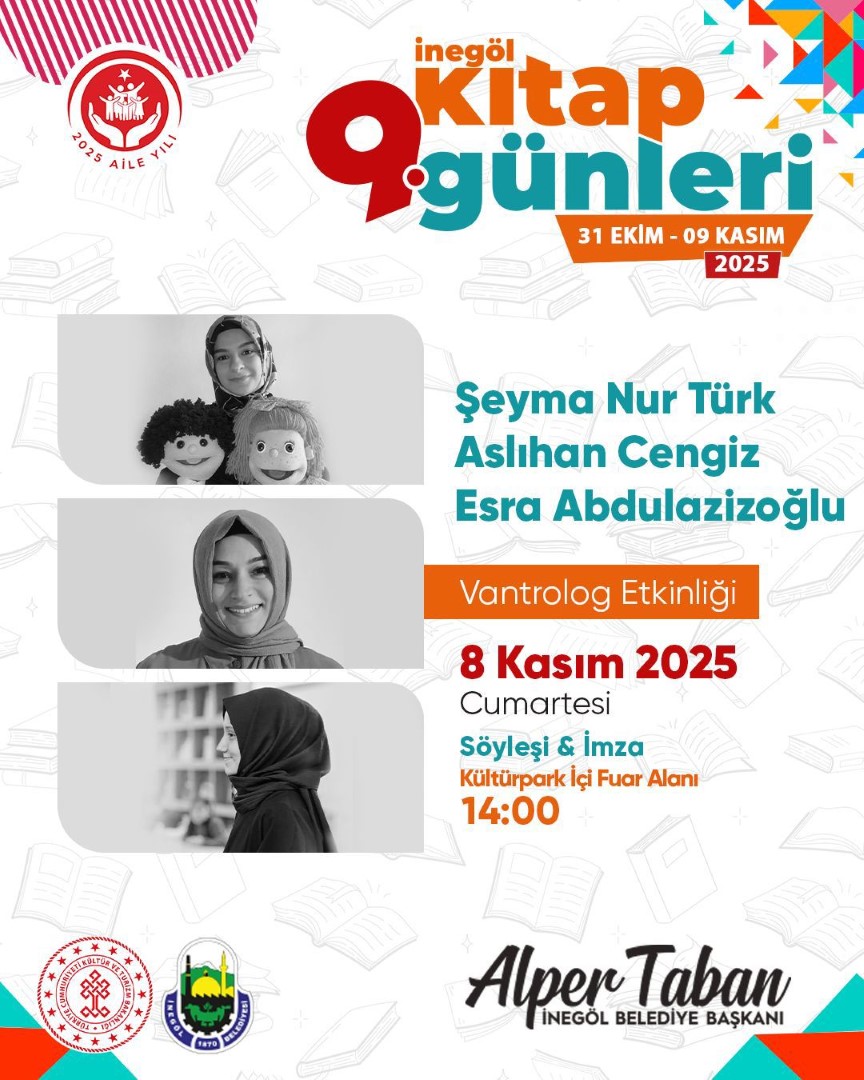 İnegöl Kitap Günleri Fuarı hafta sonları sabah 10.00 ile akşam 20.00 saatleri arasında açık olacak. Ayrıca 08 Kasım Cumartesi günü 14.00’da Şeyma Nur Türk, Aslıhan Cengiz ve Esra Abdülazizoğlu’nun katılımıyla Vantrolog Etkinliği Kitap Günleri fuar alanında gerçekleştirilecek.