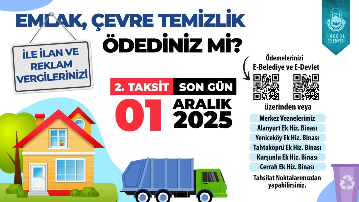 Öte yandan, Emlak Vergisi, Çevre Temizlik ve İlan Reklam Vergilerinin 2025 yılı 2. Taksit ödemesinin son günleri olan ve hafta sonuna denk gelen; 29-30 Kasım Cumartesi ve Pazar günleri de tahsilat noktalarının açık olacağı ve son ödeme günü 01 Aralık Pazartesi günü de yine tahsilat servislerinin 20.00’a kadar açık olacağı duyuruldu. Kasım ayı içerisinde de vergi dönemi süresince İnegöl Belediyesi’nin; merkez binadaki veznesi, Alanyurt Ek Hizmet Binası Tahsilat Noktası, Yeniceköy Ek Hizmet Binası Tahsilat Noktası, Tahtaköprü Ek Hizmet Binası Tahsilat Noktası, Kurşunlu Ek Hizmet Binası Tahsilat Noktası ve Cerrah Ek Hizmet Binası Muhtarlık Odasındaki tahsilat noktasında vergi ödemeleri yapılabilecek.