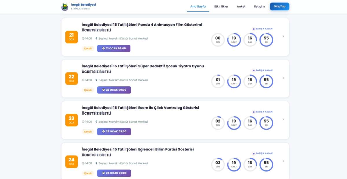 Bu sistem sayesinde vatandaşlar, etkinliklere yönelik bilgilere hızlı erişebiliyor; bilet alma sürecini internet üzerinden tamamlayabiliyorlar. Platformda etkinlikler “Çocuk”, “Kültür-Sanat”, “Konser”, “Tiyatro” ve “Söyleşi” gibi kategoriler halinde filtrelenebiliyor. Etkinlik portalı, İnegöl Belediyesi’nin dijital altyapı ve hizmetlerini güçlendirme çalışmaları çerçevesinde de önemli bir adım olarak öne çıkıyor.