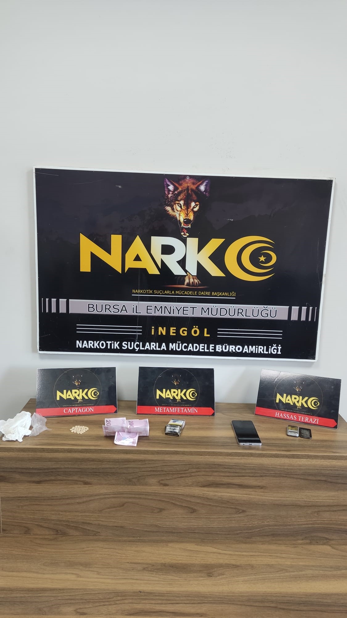 Bursa İl Emniyet Müdürlüğü Narkotik Şube Müdürlüğü İnegöl Büro Amirliği ekipleri şüphelendikleri şahsı takibe aldılar. Takip sırasında şüpheli polis ekiplerinden kaçmaya başladı. Ekipler şüpheliyi kovalamaca sonucu yakaladılar. Yakalanan Suriye uyruklu Cemal E.(32)’nin üzerinde yapılan aramada 12 gram metanfetamin uyuşturucu maddesi ile 38 adet Captagon uyuşturucu hap ve hassas terazi ele geçirildi.