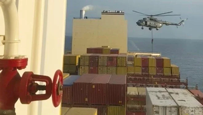 İran, Hürmüz Boğazı’na yakın Fujairah’ın 92 kilometre kuzeydoğusunda, İsrailli bir geminin “bölgesel yetkililer” tarafından ele geçirildiğini açıkladı. Ele geçirilen gemide 25 kişilik bir mürettebat bulunmaktaydı. Bir savunma yetkilisinin kaydettiği videoda, komandoların geminin güvertesinde bulunan bir konteyner yığınının üzerine iple indiği görülüyor. Söz konusu helikopterin, geçmişte başka gemi baskınları da gerçekleştiren İran’ın Devrim Muhafızları tarafından kullanıldığı tespit edildi.