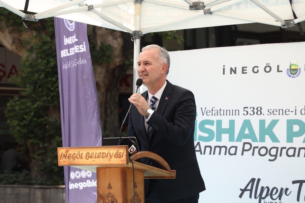 İshak Paşa’nın vefatının 538. yılını anma programında konuşma yapan İnegöl Belediye Başkanı Alper Taban, “İshak Paşa’nın vefatının 538. Yıldönümünü anıyoruz. 3 yıldır anma programları gerçekleştiriyoruz. Bizden önce de gerçekleştirildiyse de Allah razı olsun. Burada İshak Paşa’nın nasıl bir devlet adamı olduğu, nasıl Allah yolunda bir insan olduğunu gördükten ve öğrendikten sonra buradan geçişim ve kendisine bakışım değişti. Böylesine önemli bir kişi bizim topraklarımızda meftun. Peygamber efendimizin (s.av) sözlerine mazhar olmuş bir insan. İşte burada yatıyor. Bizde onun hemşerileriyiz, evlatlarıyız, torunlarıyız. Bundan dolayı da çok mutlu olduğumu ifade etmek istiyorum. İnşallah biz de onlara yakışır birer nesil, birer yöneticiler oluruz. İnşallah sorumluluğunu bile, bu emaneti en güzel şekilde taşıyan, en güzel şekilde gelecek nesillere aktaranlardan oluruz” dedi.