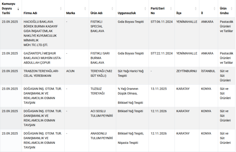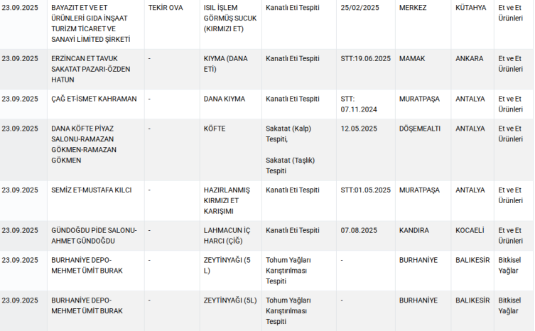 Tarım ve Orman Bakanlığı, halkın güvenilir gıdaya ulaşabilmesi için denetimlerin aralıksız sürdüğünü belirterek uygunsuzluk tespit edilen ürünleri “guvenilirgida.tarimorman.gov.tr” adresinden paylaşıyor.