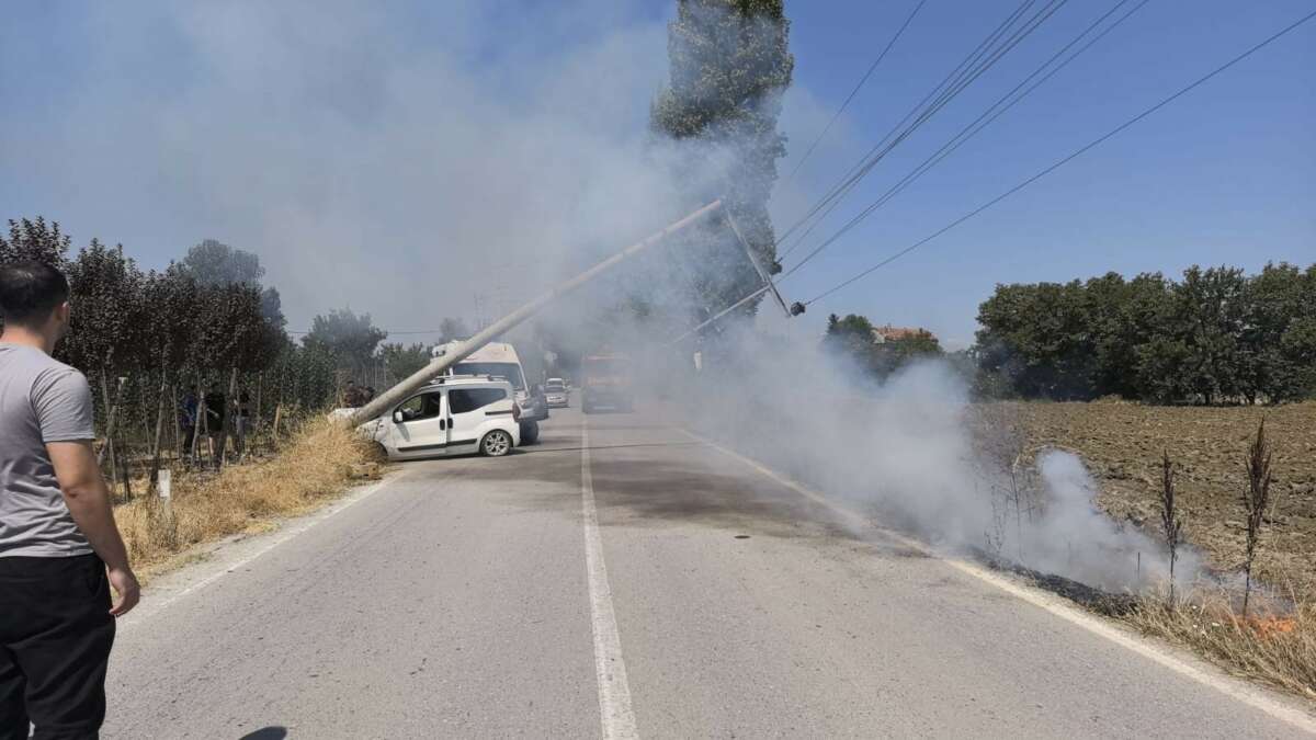 Jandarma komutanlığı ekiplerinin kazayla ilgili tahkikatı sürerken, tamamen devrilmek üzere olan direğin altından geçen sürücüler, dikkatlerden kaçmadı.