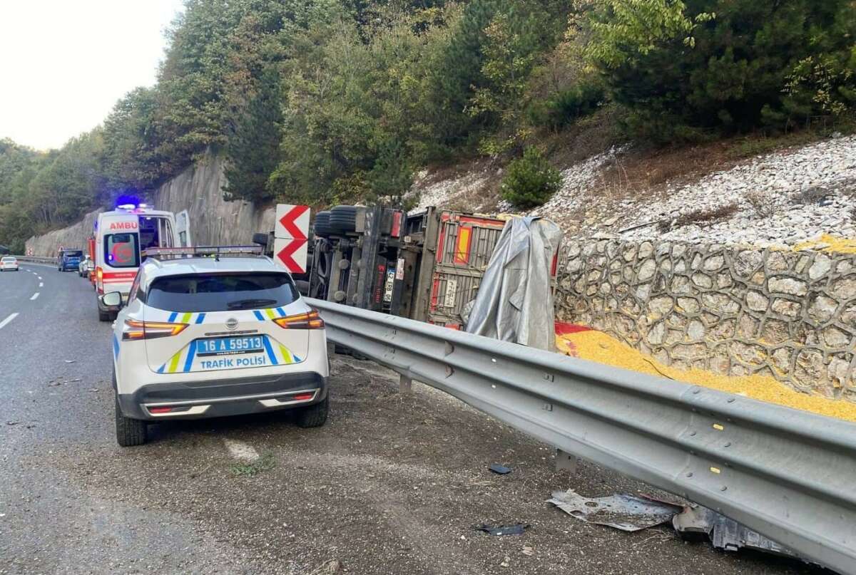 Konya’dan Bursa‘ya seyir halinde olan Ahmet S.(32) yönetimindeki 42 ERG 17 plakalı TIR, virajda sürücüsünün kontrolünden çıktı. Yoldan çıkan TIR, istinat duvarına çarpıp devrildi. Kaza sonucu sürücü ile yanındaki eşi Saliha S.(34) yaralandı. Yaralılar kaza yerine sevk edilen ambulansla İnegöl Devlet Hastanesine kaldırıldı.