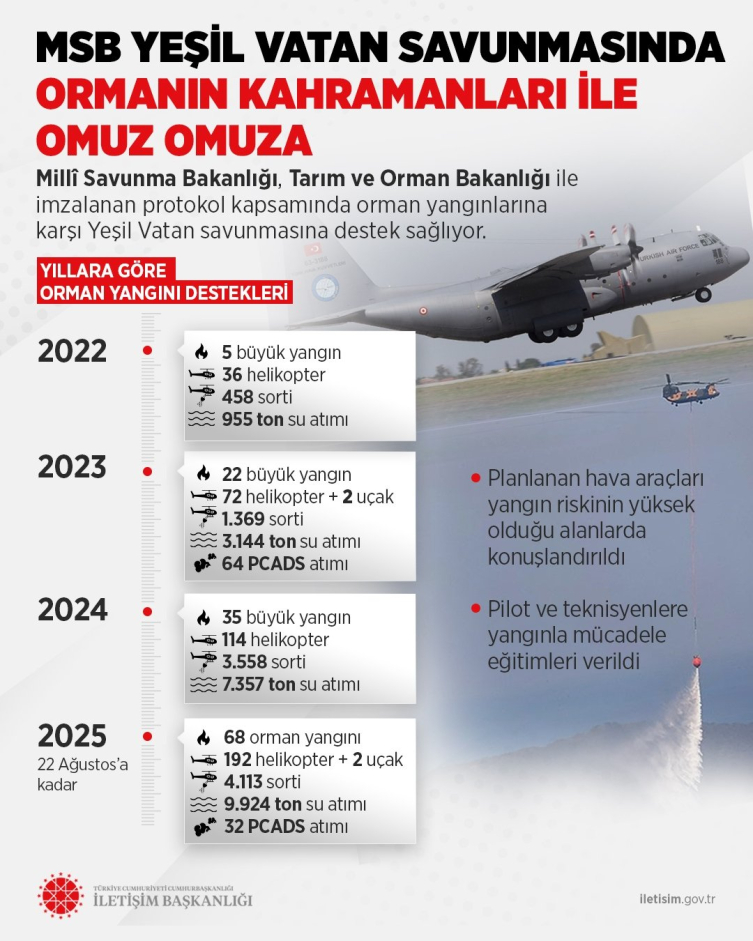 2025’te ise rekor seviyeye ulaşıldı. 22 Ağustos itibarıyla 68 yangına müdahale edildi. Operasyonlarda 192 helikopter ve 2 uçak görev alırken, 4 bin 113 sortide 9 bin 924 ton su atımı gerçekleştirildi. Ayrıca 32 PCADS atımı yapıldı.
