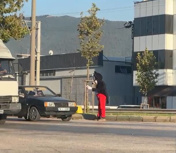 Bursa’da trafik lambalarında elinde mendillerle Miki Fare’yi görenler, gözlerine inanamadı.