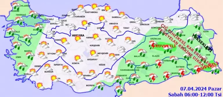 Ayrıca, Tunceli, Elazığ, Bingöl, Batman, Muş, Bitlis, Siirt, Şırnak, Ağrı, Hakkari çevreleri ile Diyarbakır’ın kuzeydoğusu, Mardin’in doğusu ve Van’ın güneyinde lokal olarak kuvvetli yağışlar beklendiğinden ani sel, su baskını, yıldırım, yerel dolu yağışı, dik ve eğimli yamaçlarda kar erimesine bağlı heyelan ve çığ tehlikesi gibi olumsuzluklara karşı dikkatli olunması gerektiği belirtildi.