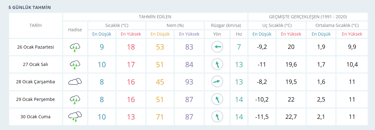 Tahminlere göre pazartesi ve salı günleri sağanak yağış görülecek. Çarşamba günü havanın çok bulutlu olması beklenirken, perşembe ve cuma günleri yeniden sağanak yağışın etkili olacağı öngörülüyor.