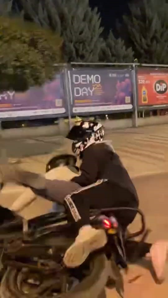 Kaza anı, çevredeki bir sürücünün cep telefonu kamerasına yansıdı. Görüntülerde, motosikletin ön tekerleğini kaldırmaya çalıştığı sırada devrildiği ve iki kişinin yola savrulduğu anlar yer alıyor.