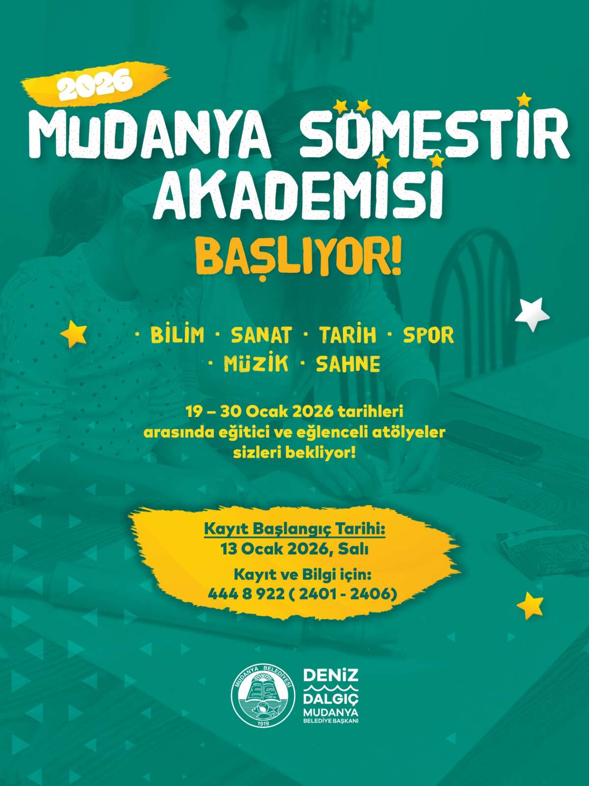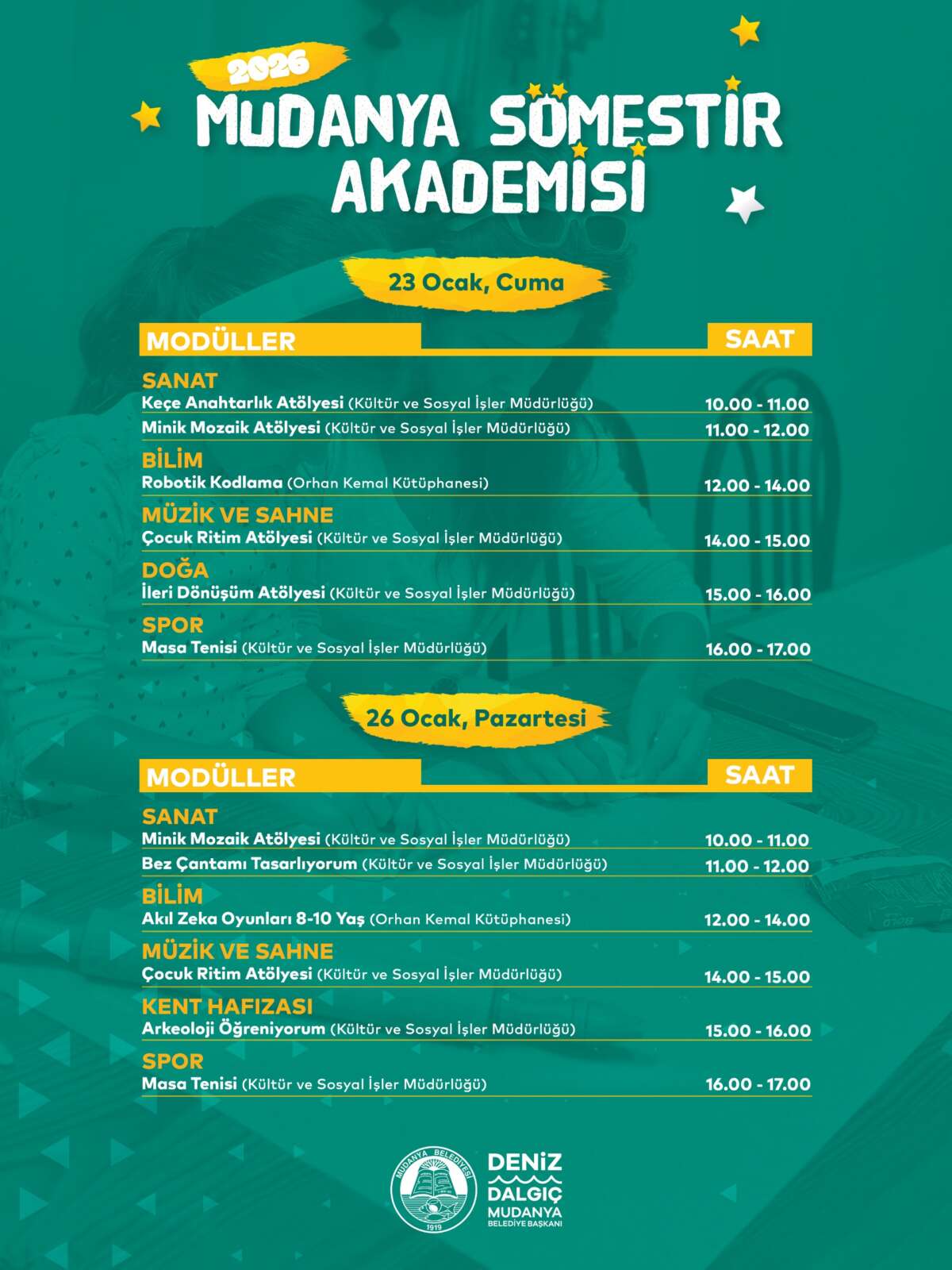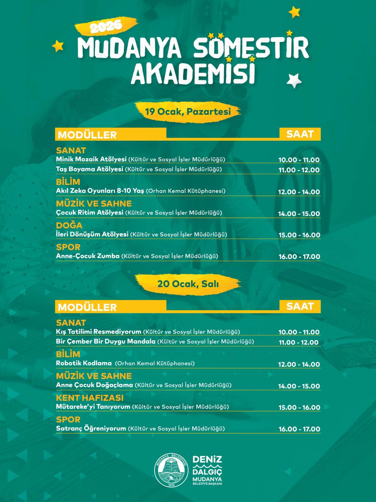 Yarıyıl tatili boyunca çocukların kaliteli zaman geçirebilecekleri, sosyalleşebilecekleri ve yaratıcılıklarını keşfedebilecekleri etkinlikler hazırladıklarını belirten Mudanya Belediye Başkanı Deniz Dalgıç, “Düzenlediğimiz kurslarla çocuklarımızın gelişimine katkı sağlıyor, onların hem eğitici hem de eğlenceli deneyimler yaşamalarını önemsiyoruz” dedi.