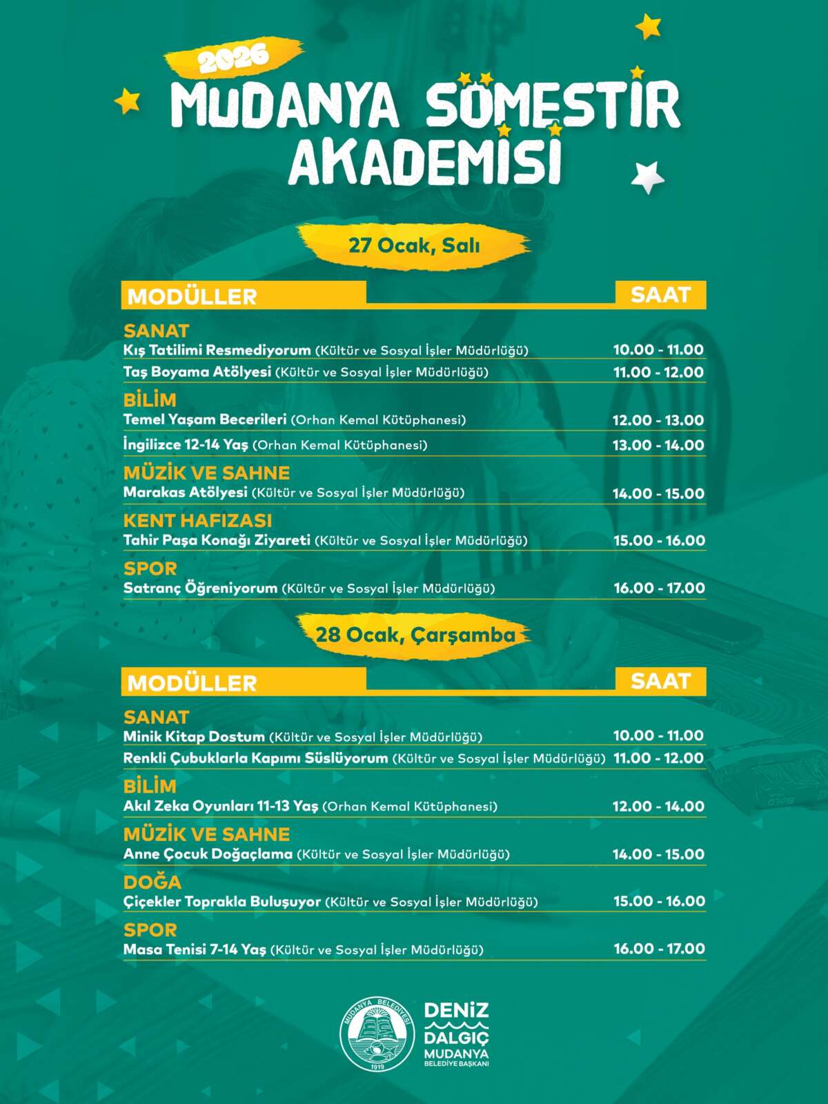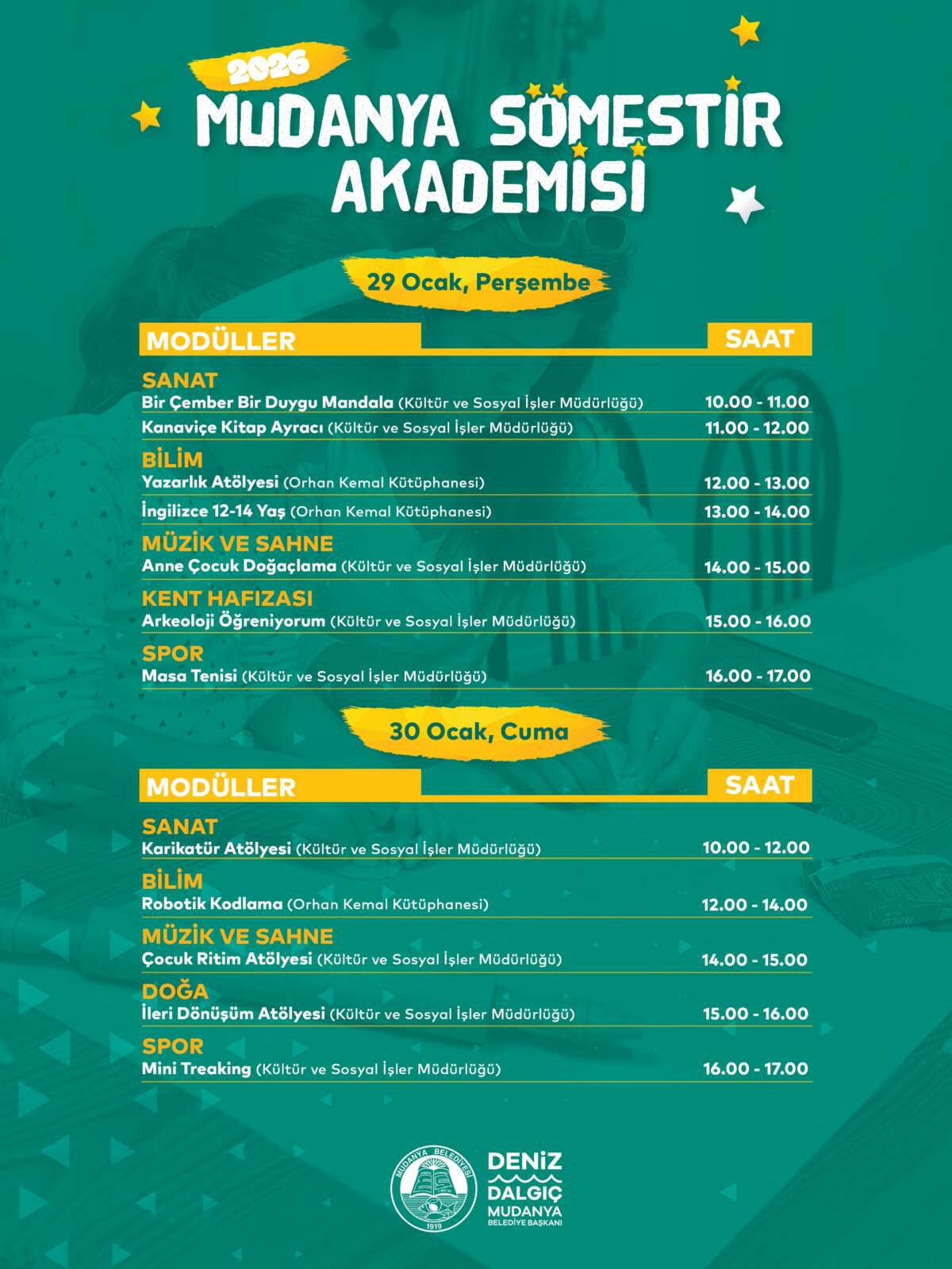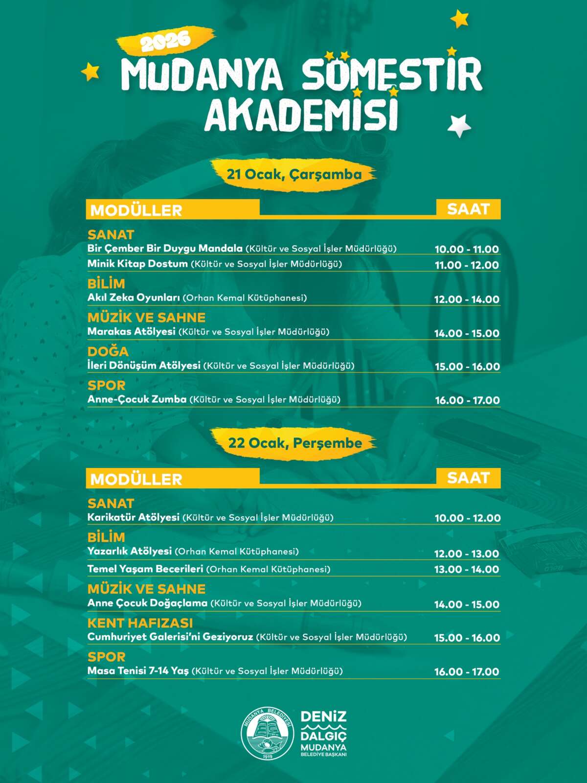 Yarıyıl tatili boyunca çocukların kaliteli zaman geçirebilecekleri, sosyalleşebilecekleri ve yaratıcılıklarını keşfedebilecekleri etkinlikler hazırladıklarını belirten Mudanya Belediye Başkanı Deniz Dalgıç, “Düzenlediğimiz kurslarla çocuklarımızın gelişimine katkı sağlıyor, onların hem eğitici hem de eğlenceli deneyimler yaşamalarını önemsiyoruz” dedi.