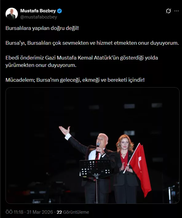 Bursalılara yapılan doğru değil! Bursa’yı, Bursalıları çok sevmekten ve hizmet etmekten onur duyuyorum. Ebedi önderimiz Gazi Mustafa Kemal Atatürk’ün gösterdiği yolda yürümekten onur duyuyorum. Mücadelem; Bursa’nın geleceği, ekmeği ve bereketi içindir!