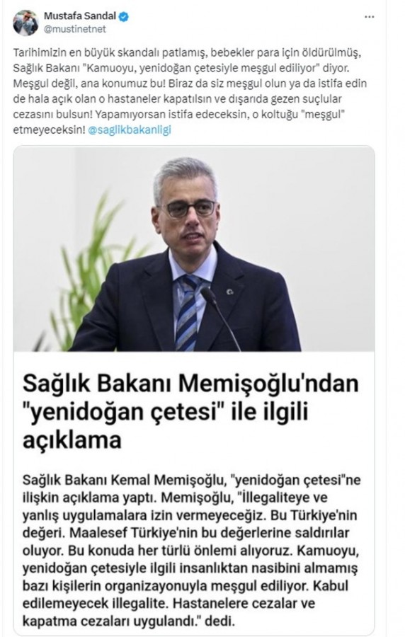 ”Tarihimizin en büyük skandalı patlamış, bebekler para için öldürülmüş, Sağlık Bakanı “Kamuoyu, yenidoğan çetesiyle meşgul ediliyor” diyor.