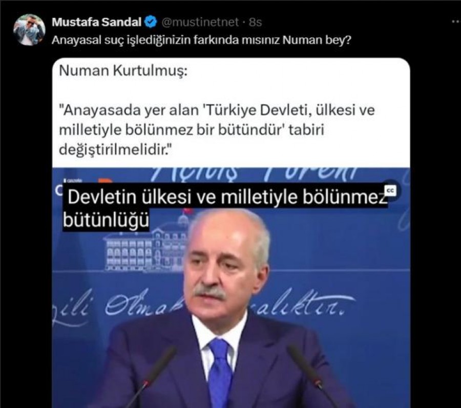 Mustafa Sandal TBMM Başkanı Numan Kurtulmuş’un sözlerini paylaşarak “Anayasal suç işlediğinizin farkında mısınız Numan bey?” diyerek tepki gösterdi.