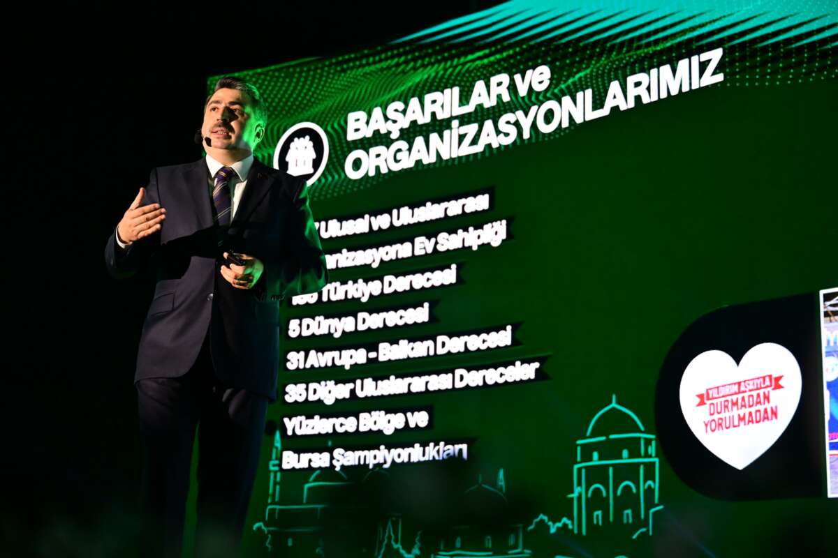 Yıldırım’ın tüm kimliklerinin yanında bir de spor kenti kimliği olduğunu belirten Başkan Oktay Yılmaz; “Yıldırım’da 7’den 77’ye herkesin spor imkanına sahip olmasını istiyoruz ve bu doğrultuda çalışıyoruz. Sadece 2025 yılında, 13 tesis 20 farklı branşta 86 bin 880 vatandaşımıza spor hizmeti verdik. Yaz spor okullarında 62 binden fazla çocuğumuza spor eğitim hizmeti sağladık. Bugün Yıldırım’daki spor tesislerimiz tüm Bursa’ya hizmet vermektedir. Spora verdiğimiz destek ve yatırımlarımızın meyvelerini de alıyoruz. Bugüne kadar 129 ulusal ve uluslararası organizasyona ev sahipliği yaptık. Sporcularımız 186 Türkiye derecesi, 5 dünya derecesi, 35 Avrupa- Balkan derecesi- 35 farklı uluslararası derece ve yüzlerce bölge ve Bursa derecesi elde etti” diye konuştu.
