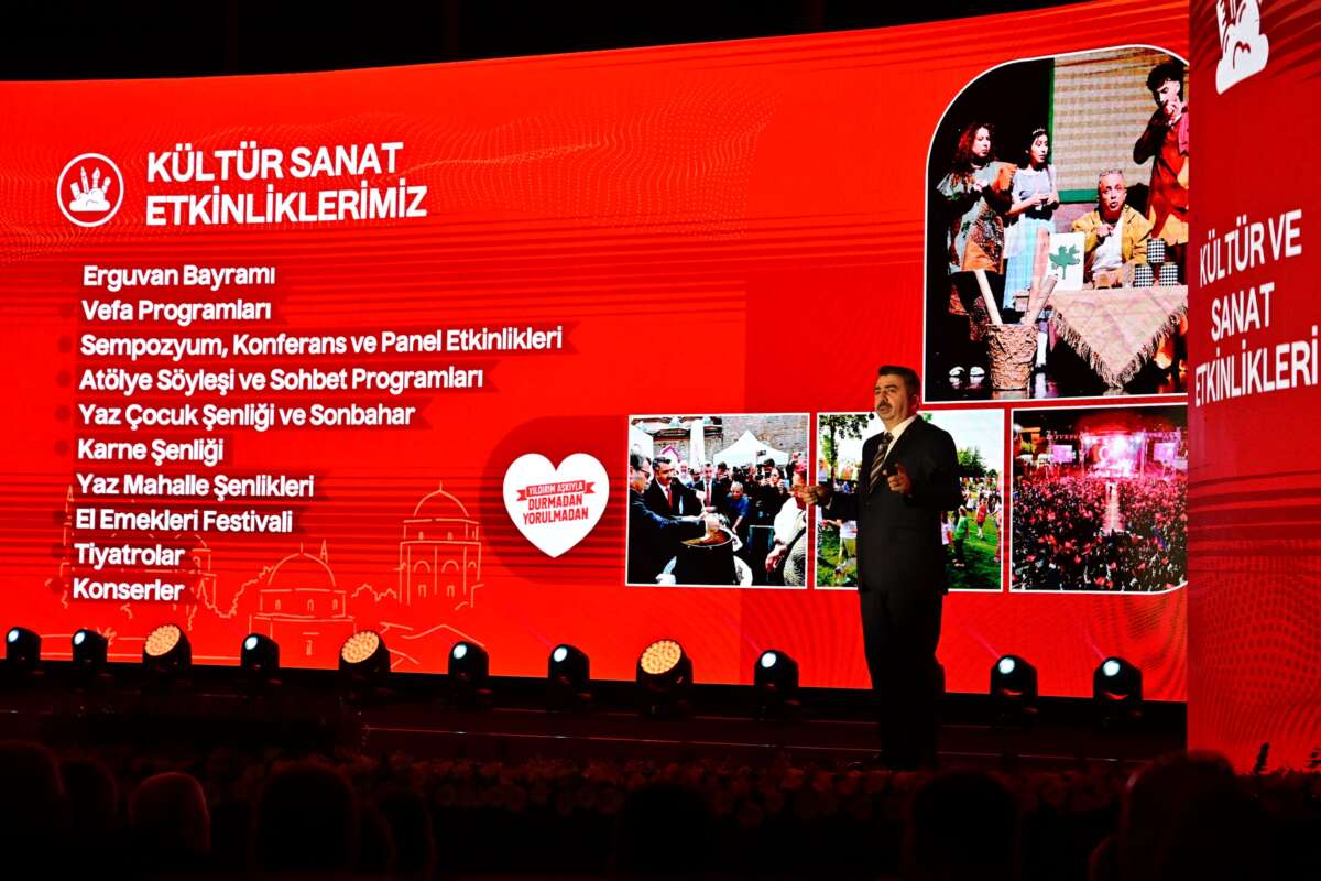 Yıldırım’ın sosyal ve kültürel yaşamına katkı sağlayacak önemli merkezleri de ilçeye kazandırdıklarını vurgulayan Başkan Yılmaz; “Alev Alatlı Şehir Düşünce ve Sanat Merkezi, Hacıseyfettin Sanat ve Zanaat Merkezi, Setbaşı Sanat Merkezi, Teknopark, Yapay Zeka ve Teknoloji Merkezi, Duaçınarı Kültür Merkezi, Makbule Tevfik Yıldırım Engelsiz Yaşam Merkezi, Arabayatağı Gençlik Merkezi, Piremir Gençlik ve Spor Merkezi, Yavuzselim Gençlik Merkezi, Mollayegan Çocuk Üniversitesi projelerimiz ile Yıldırım’a değer kattık. Bu projelerimizden hizmette olanlar var, yapımı devam edenler var. Özellikle Duaçınarı Kültür Merkezi’ne değinmek istiyorum. Buranın ihalesini tamamladık. Bu projenin bedeli yaklaşık 1 milyar lira. Biz bu projenin içine ticari alanlarda ekledik. Ve Belediye’nin cebinden para çıkmadan bu projeyi tamamlayacağız. İnşallah bittiğinde Yıldırım’ın çok önemli bir ihtiyacını karşılayacak” diye konuştu.