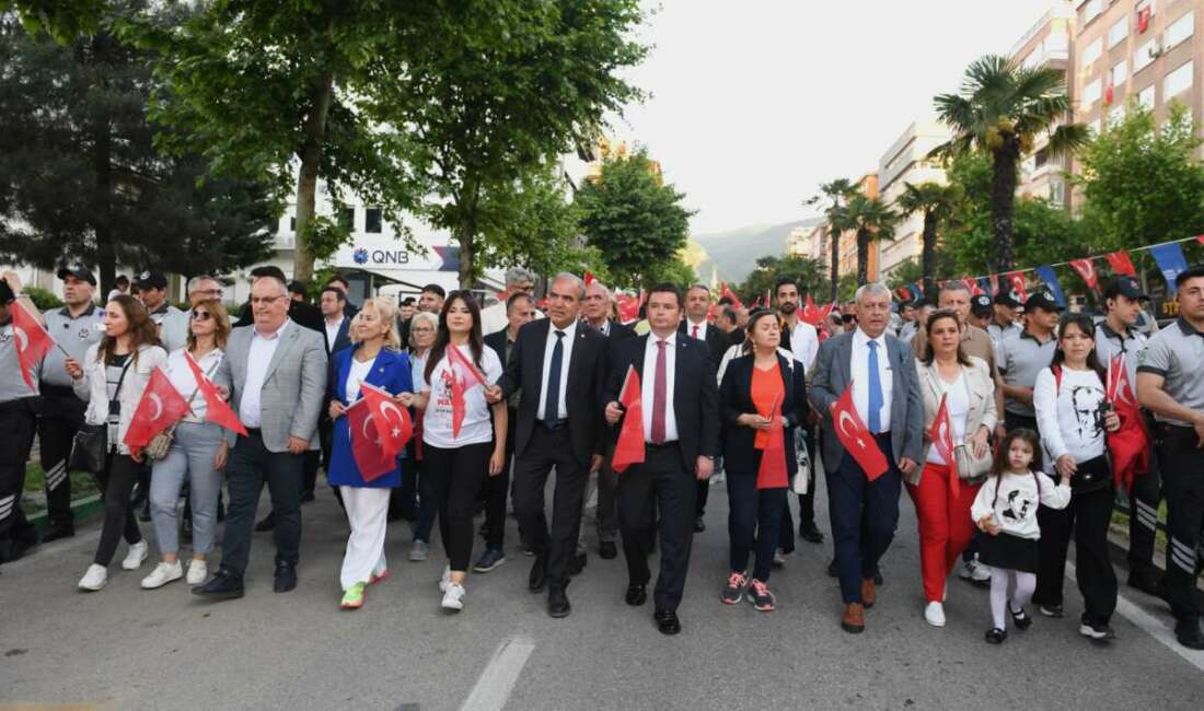 19 Mayıs coşkusunun caddelere sığmadığı yürüyüşe, Osmangazi Belediye Başkanı Erkan Aydın, CHP Osmangazi İlçe Başkanı Raşit Gürbüz, başkan yardımcıları, meclis üyeleri ve yüzlerce vatandaş katıldı. Osmangazi Belediye Başkanı Erkan Aydın, yaptığı açıklamada, “Atamızın gençlere armağanı olan 19 Mayıs Atatürk’ü Anma, Gençlik ve Spor Bayramı’nı, gençlerimiz ile birlikte kutluyoruz. 7’den 70’e yüzlerce Bursalı vatandaşımız ve Bursasporlu taraftarlarımız ile 19 Mayıs coşkusunu birlikte yaşadık. Şunu çok iyi biliyoruz ki 106 yıl önce Atatürk ve silah arkadaşları Samsun’a indiklerinde, zaferden ve başarıdan bir gün olsun şüphe etmedi. Önce kendileri inandı, sonra da bu ülkenin insanlarını zafere inandırdılar. Kurtuluş Savaşı’nı da kazanarak bizim bugün özgür bir şekilde 19 Mayıs’ı kutlamamızı sağladılar. Onları hiçbir zaman unutmayacağız. O gün emperyalist devletler tarafından oynanan oyunların, bugün de oynandığının farkında olmalıyız. Önderimiz ve ebedi liderimiz Mustafa Kemal Atatürk’ün ışığında ülkemizin üzerinde oynanan oyunları geçmişte olduğu gibi bugün de bozacağız. Atatürk’ün cumhuriyeti ve geleceği emanet ettiği gençlerimiz, cumhuriyete de, Atatürk’e de bayramına da sahip çıkıyor. Şunu çok rahatlıkla söyleyebilirim; 100 yıl önce emperyalist devletler hain planlarını nasıl uygulayamadılarsa, bugün de uygulayamayacaklar. Bunun en büyük güvencesi de gençlerimizdir. Tüm gençlerimizin, 19 Mayıs Atatürk’ü Anma, Gençlik ve Spor Bayramı kutlu olsun” dedi.