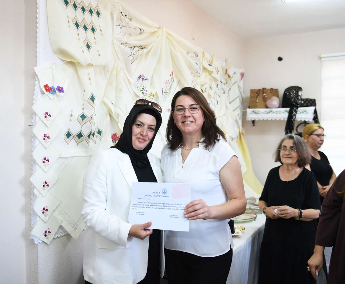 Kursu başarıyla tamamlayan kursiyerler, belgelerini Osmangazi Belediyesi Sosyal Destek Hizmetleri Müdürü Sevcan Yaman, Osmangazi Halk Eğitim Merkezi Müdür Yardımcısı Müzeyyen Karaca ve Adnan Bağrıyanık’ın elinden aldı.