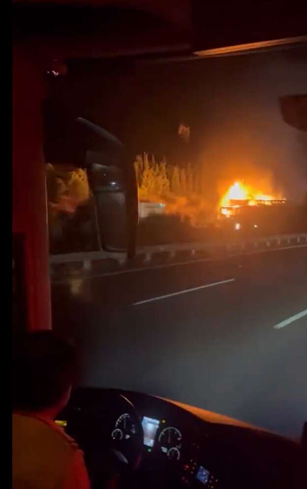 Gebze-Orhangazi-İzmir Otoyolu’nda gece saatlerinde seyir halindeki bir tırın motor bölümünden aniden dumanlar yükselmeye başladı. Alevler kısa sürede aracı sardı. Sürücü, aracı yol kenarına çekip kendini dışarı atmayı başardı. Bu sırada aracın yanından geçen başka bir sürücü ise alevler içindeki tırda yaşanan patlama anını anbean cep telefonu kamerasıyla kaydetti.