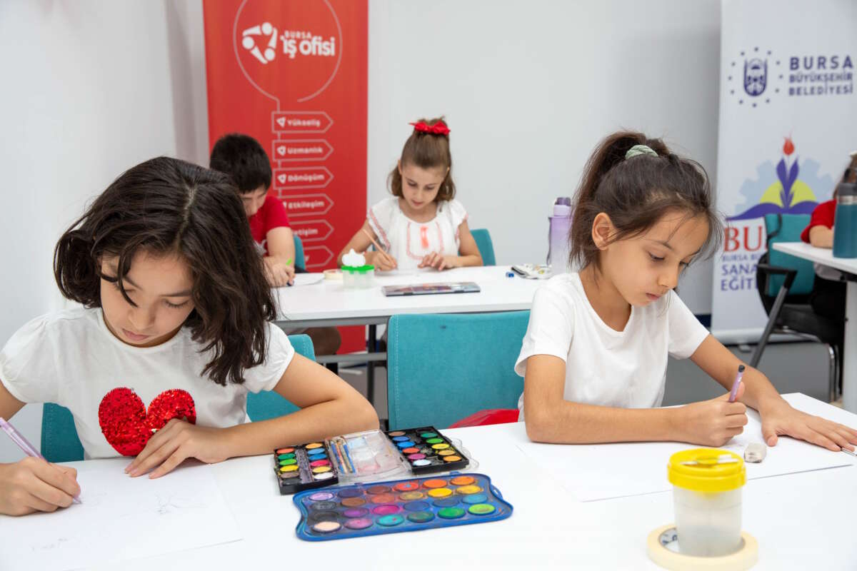 Bursa’nın 14 ilçesindeki 25 farklı mekanda faaliyet yürüten ve bugüne kadar 540 branşta eğitimler veren Büyükşehir Belediyesi bünyesindeki BUSMEK, her yaştan Bursalının sanatsal yeteneklerini geliştirmesi ve verimli vakit geçirebilmesi için birbirinden renkli atölyeler düzenliyor. Büyükşehir Belediyesi İnsan Kaynakları ve Eğitim Dairesi Başkanlığı İş ve Meslek Edindirme Şube Müdürlüğü tarafından hazırlanan ‘Renklerin Suyla Dansı’ temalı sulu boya atölyesine, 8-12 yaş arasındaki çocuklar büyük ilgi gösterdi. Sulu boyayla hayallerini kağıtlara yansıtan çocuklar, gün boyunca hem eğlendi hem de öğrendi. Atölyeye katılan çocuklar birbirinden farklı ve renkli eserler ortaya çıkararak özgüvenlerini pekiştirirken, sosyal becerilerini geliştirme ve yeni arkadaşlıklar kurma imkanı da buldu. Bu tür atölye çalışmalarının çocukların gelişimine büyük katkı sağladığını belirten veliler, Büyükşehir Belediye Başkanı Mustafa Bozbey’e teşekkür etti.