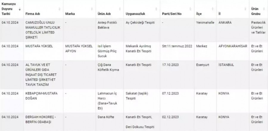 Vatandaşların sağlıklı gıdaya erişmesi için Tarım ve Orman Bakanlığı yaptığı denetimler sonrası uygunsuz olan ürünleri ifşa etmeye devam ediyor. Her gün yenilenen ve yenileri eklenen uygunsuz ürünler listesine yeni markalar ve ürünler girdi.