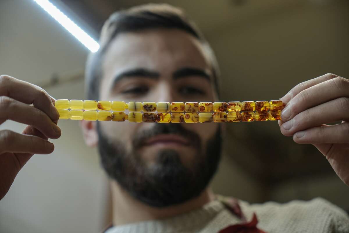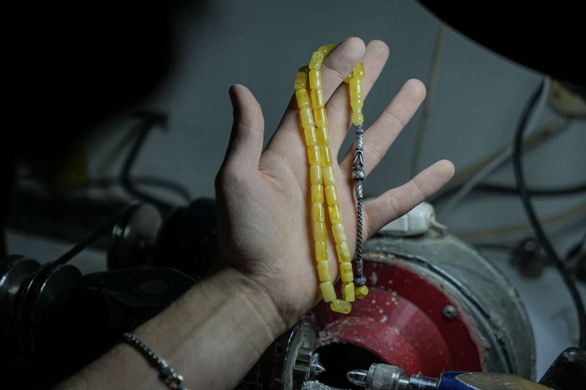 4 kuşaktır tespih üretimi yapan Murat Cengiz, “Damla kehribar, çam reçinesinin özüdür. Soba yakarken tutuşturduğumuz çıraların içerisindeki özdür. İsmi çam sakızı diye de geçer. Ağaçtan toprak altına akması ve milyonlarca yıl orada fosilleşip aynı kömür gibi kaya haline gelmesi ile oluşur. Kaya haline geldikten sonra topraktan çıkarılıp kolye, tespih ve diğer takılar yapılıyor. Doğal olması, çıkarılması ve temin edilmesi zorlu bir süreç olduğundan dolayı pahalı. Şu an Türkiye’de olmadığı için yurt dışından geliyor. Yurt dışından gelmesi de fiyatını yükseltiyor. Damla kehribar kolyelerinin kullanılması guatr ve tiroit bezi üzerindeki etkisinden dolayı sağlık açısından çok faydalı” diye konuştu