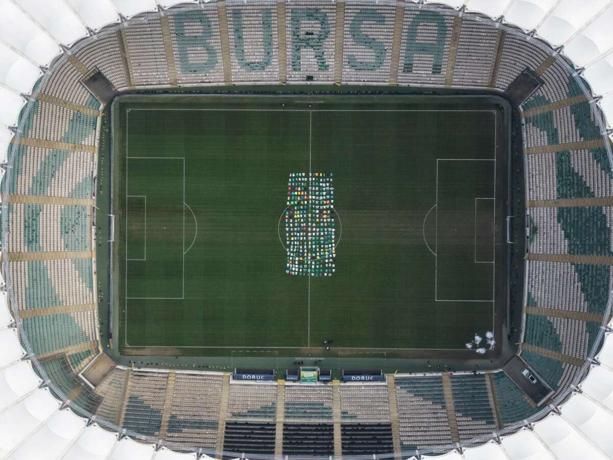 Bursaspor sahasında gerçekleştirilen özel çalışmada, koleksiyoner Mustafa Turan’a ait, bir kısmı maçlarda giyilmiş, bir kısmı ise imzalı koleksiyon formalarından oluşan 308 forma sahada çim zemine dizilerek koreografi oluşturuldu.