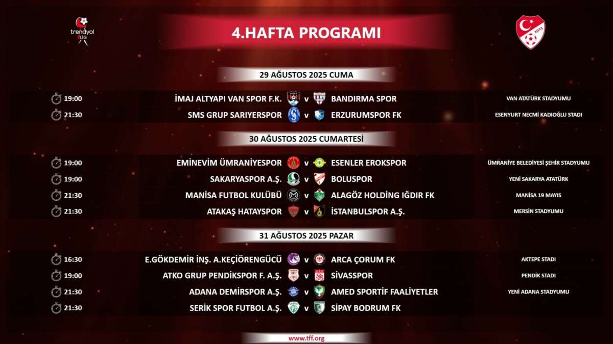 Trendyol 1. Lig’in 3 ve 4. haftasında oynanacak müsabakaların programı belli oldu. Türkiye Futbol Federasyonu’ndan yapılan açıklamaya göre 1. Lig’de 3 ve 4. haftaların programı şu şekilde:
