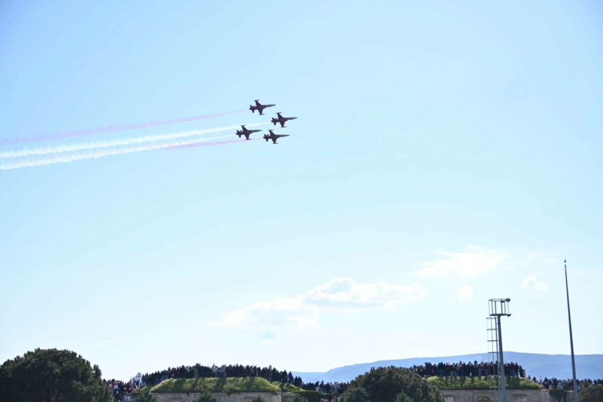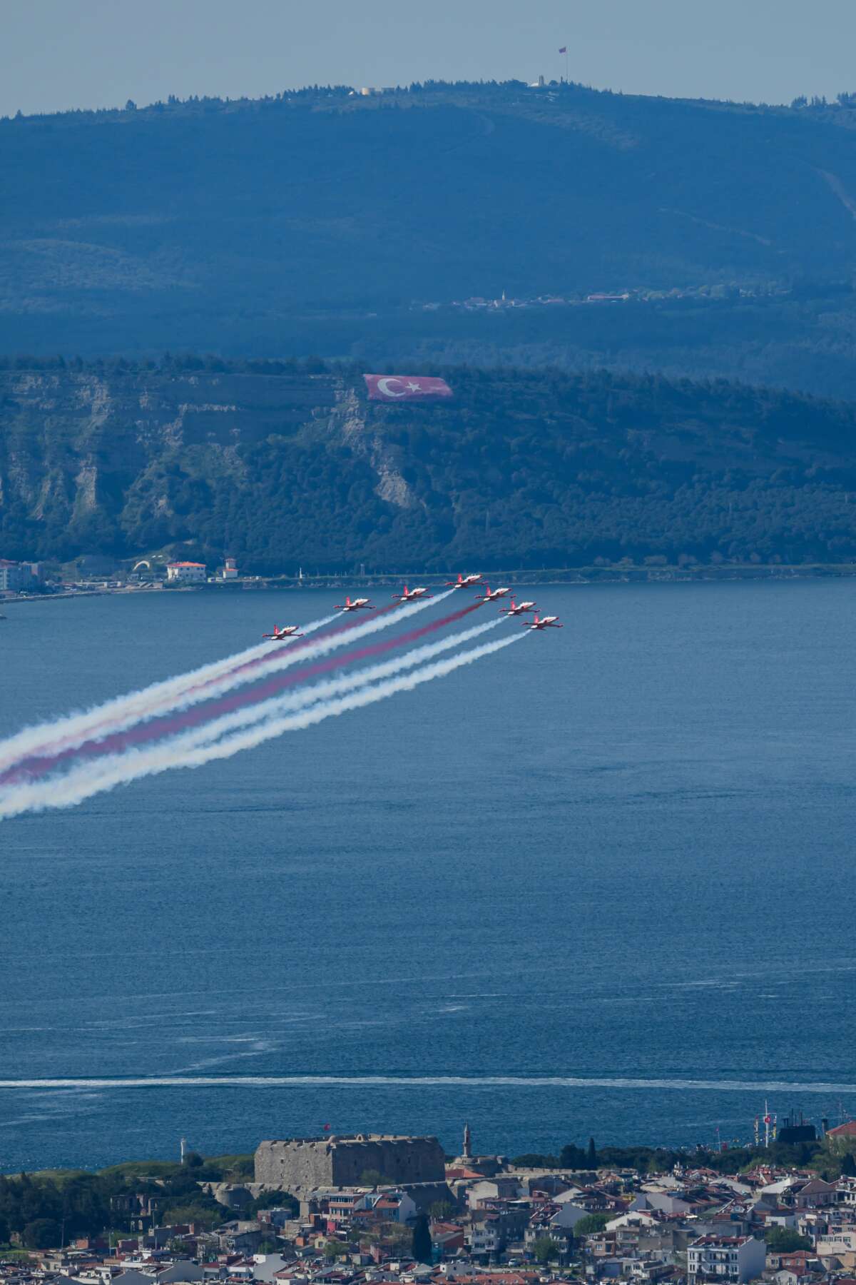 Türk Hava Kuvvetleri akrobasi timi Türk Yıldızları, Çanakkale Savaşları Gelibolu Tarihi Alan Başkanlığı tarafından düzenlenen Türkiye Büyük Millet Meclisi’nin kuruluşunun 106’ncı yıl dönümü ve Büyük Önder Mustafa Kemal Atatürk’ün çocuklara armağan ettiği 23 Nisan Ulusal Egemenlik ve Çocuk Bayramı kutlamaları kapsamında Anadolu Hamidiye Tabyası üzeri ve Çanakkale Boğazı semalarında gösteri uçuşu gerçekleştirdi. 7 pilot Anadolu Hamidye Tabyasında binlerce kişiyi selamladı. Gösteride, pilotlar çeşitli uçuş düzenleriyle unutulmaz anlar yaşattı.