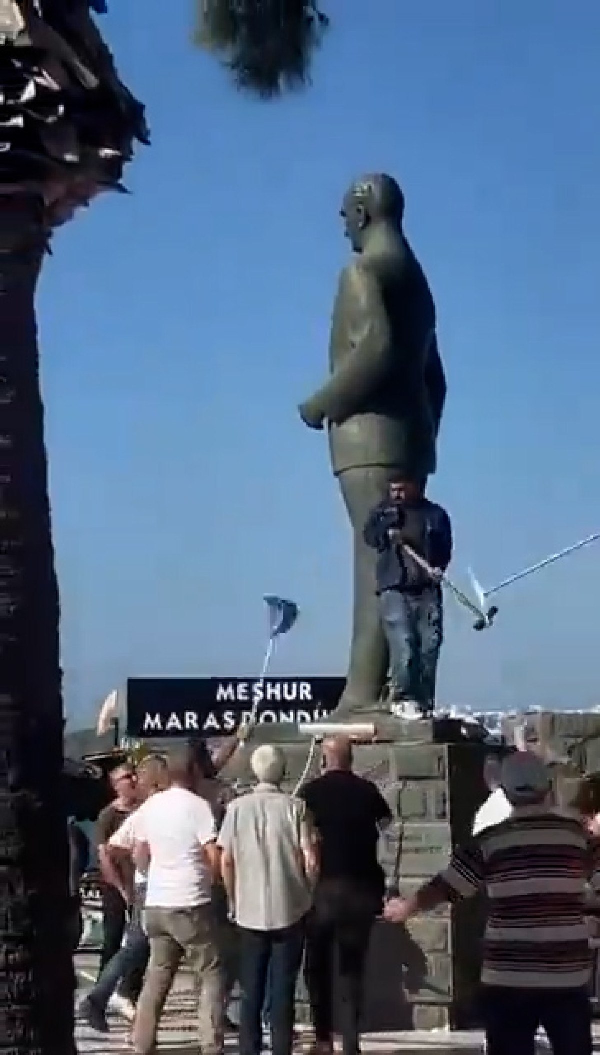 Vatandaşlar, ellerine geçen ne varsa şahsı büstten indirmek için fırlattı.