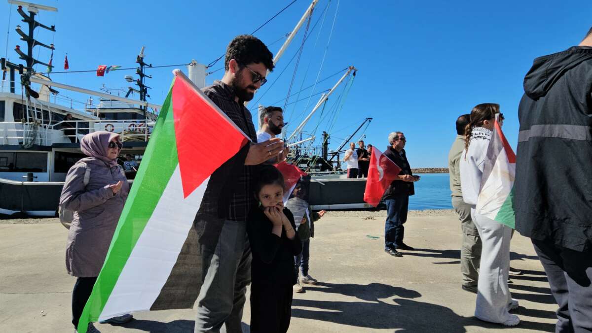 Tekneler Türk ve Filistin bayraklarıyla donatılırken, karada toplanan İzmir Sivil Toplum Kuruluşları Platformu üyeleri de meydanda ellerinde bayraklarla destek verdi.