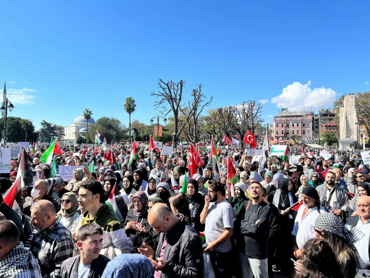 İstanbul’da Filistin’e Destek Platformu öncülüğünde düzenlenen yürüyüşte, Ayasofya Camii önünde toplanan kalabalık, Filistin bayrakları ve pankartlarla “Katil İsrail, Filistin’den defol”, “Gazze’ye selam, direnişe devam” ve “Nehirden denize özgür Filistin” sloganları attı.
