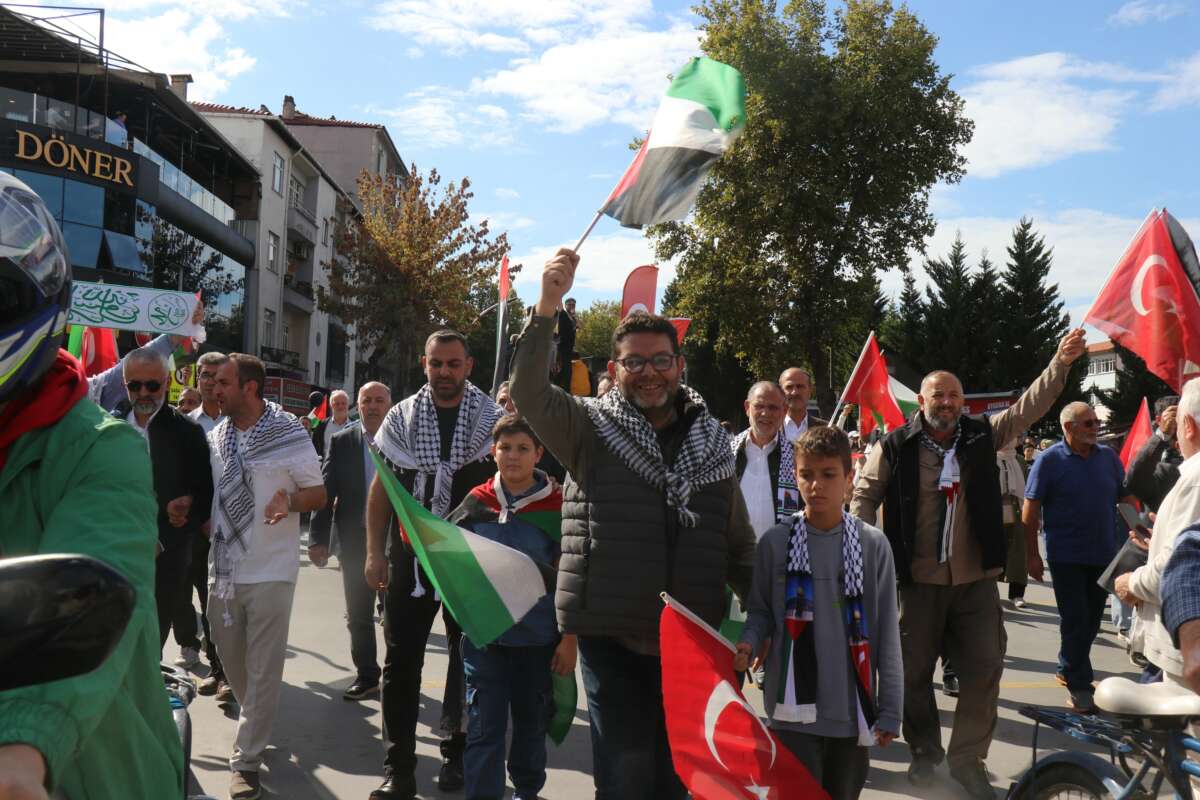 Düzce’de Cedidiye Meydanı’nda düzenlenen yürüyüşte sivil toplum kuruluşları üyeleri ellerindeki fotoğraf ve pankartlarla İsrail saldırılarını protesto etti.