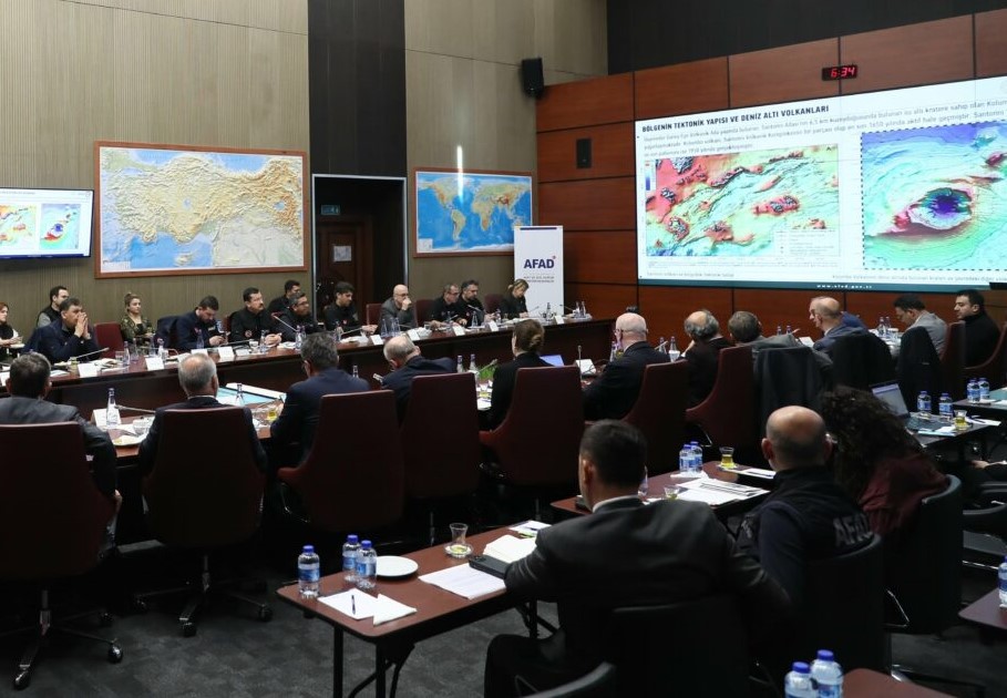 İçişleri Bakan Yardımcısı Münir Karaloğlu başkanlığındaki değerlendirme toplantısında; Ege Denizi Santorini Adası ve civarında 28 Ocak 2025 tarihinden itibaren görülen sismik aktivite sonucu meydana gelebilecek muhtemel daha büyük bir deprem, tsunami veya bir volkanik patlamanın, Türkiye kıyıları için oluşturabileceği tehlikeler, alınan önlem ve hazırlıklar AFAD, MTA, Meteoroloji Genel Müdürlüğü, Kandilli Rasathanesi ve Deprem Araştırma Enstitüsü, uzman bilim insanları ve araştırmacılarla değerlendirildi.